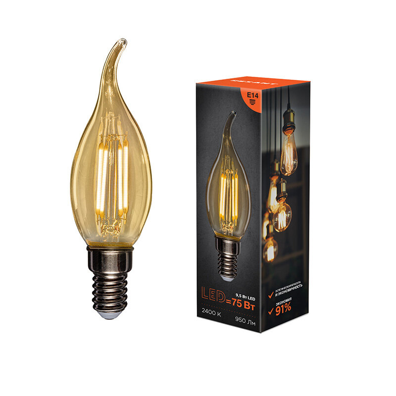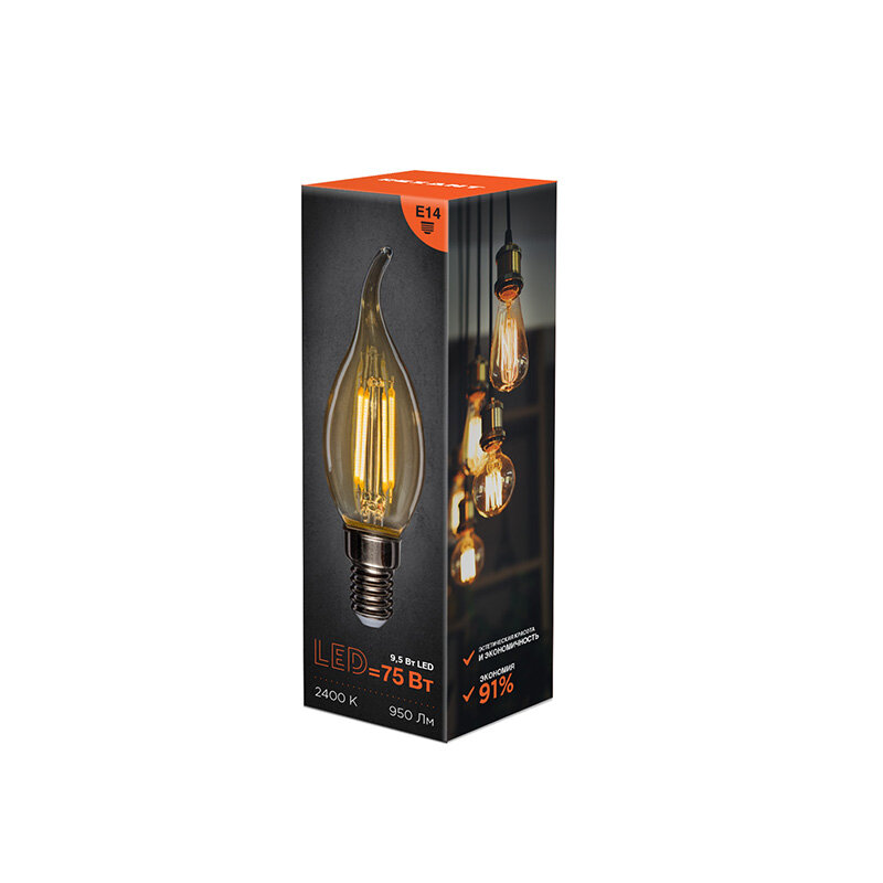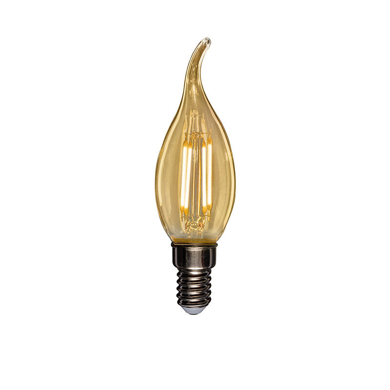 Филаментная золотистая лампа CN37 в форме свечи на ветру прекрасно подходит для дизайнерского освещения комнат, домов, гостиниц, кафе и других объектов. Филаментные светодиодные лампы сочетают в себе все лучшие свойства, присущие матричным LED-лампам и традиционным лампам накаливания. Внешне они похожи на классические лампы накаливания, но их техническая часть ничуть не уступает стандартным LED- лампам: лампочка мгновенно зажигается, не нагревается, не искажает реальные оттенки предметов, не мерцает и рассчитана на долговечную службу порядка 30.000 часов. Также несомненным плюсом таких ламп является большая экологичность, нежели у аналогов: утилизация ламп не требует особых мер. Их можно вынести с бытовыми отходами, так как они безопасны и для окружающей среды. Лампа обладает мощностью в 9.5Вт, распространенным цоколем типа Е14 и излучает теплое белое свечение в 2400K и световым потоком 950 Лм. Благодаря своему ненавязчивому дизайну и продуманной конструкции, такие лампы можно вкручивать во многие осветительные приборы - как в открытые, так и в закрытые плафоны. Эффективное отведение тепла допускает монтаж возле натяжных и гипсокартонных потолков.
