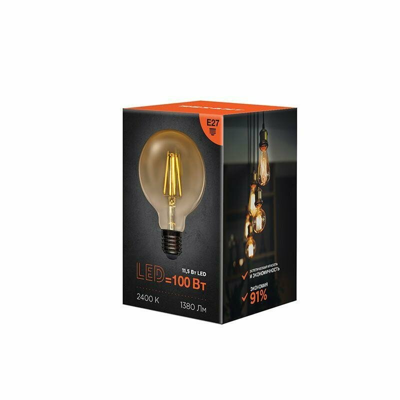 Филаментная золотистая лампа А95 в форме груши на прекрасно подходит для дизайнерского освещения комнат, домов, гостиниц, кафе и других объектов. Филаментные светодиодные лампы сочетают в себе все лучшие свойства, присущие матричным LED-лампам и традиционным лампам накаливания. Внешне они похожи на классические лампы накаливания, но их техническая часть ничуть не уступает стандартным LED- лампам: лампочка мгновенно зажигается, не нагревается, не искажает реальные оттенки предметов, не мерцает и рассчитана на долговечную службу порядка 30.000 часов. Также несомненным плюсом таких ламп является большая экологичность, нежели у аналогов: утилизация ламп не требует особых мер. Их можно вынести с бытовыми отходами, так как они безопасны и для окружающей среды. Лампа обладает мощностью в 11.5Вт, распространенным цоколем типа Е27 и излучает теплое белое свечение в 2400K и световым потоком 1380 Лм. Благодаря своему ненавязчивому дизайну и продуманной конструкции, такие лампы можно вкручивать во многие осветительные приборы - как в открытые, так и в закрытые плафоны. Эффективное отведение тепла допускает монтаж возле натяжных и гипсокартонных потолков.