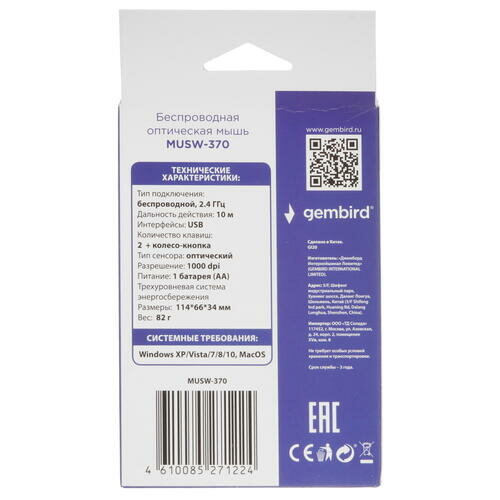Gembird представляет собой классическую беспроводную оптическую мышь симметричной формы, благодаря чему ее одинаково удобно использовать как правой, так и левой рукой. Посредством ресивера USB представленная модель может быть подключена к персональному компьютеру или ноутбуку. Благодаря поддержке Plug-n-play, мышка быстро определяется и конфигурируется системой. Передача сигнала от мышки к ресиверу осуществляется на частоте 2.4 ГГц. Чувствительный оптический сенсор обеспечивает точное считывание перемещения практически по любой поверхности.