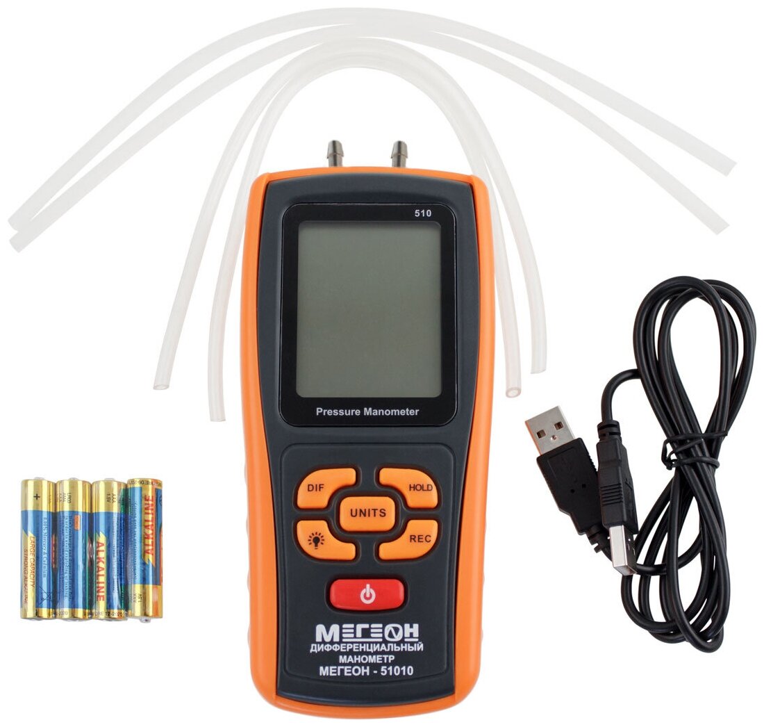 | Комплект поставки | 1. Цифровой дифференциальный манометр МЕГЕОН 51010 - 1шт., 2. Батарейки тип LR03 (ААА) – 4шт., 3. Силиконовая трубка - 2 шт., 4. Трубка ПВХ - 2 шт., 5. Кабель USB - USB - 1 шт., 6. Компакт-диск с ПО - 1 шт., 7. Руководство по эксплуатации - 1 экз., 8. Гарантийный талон - 1 экз. |