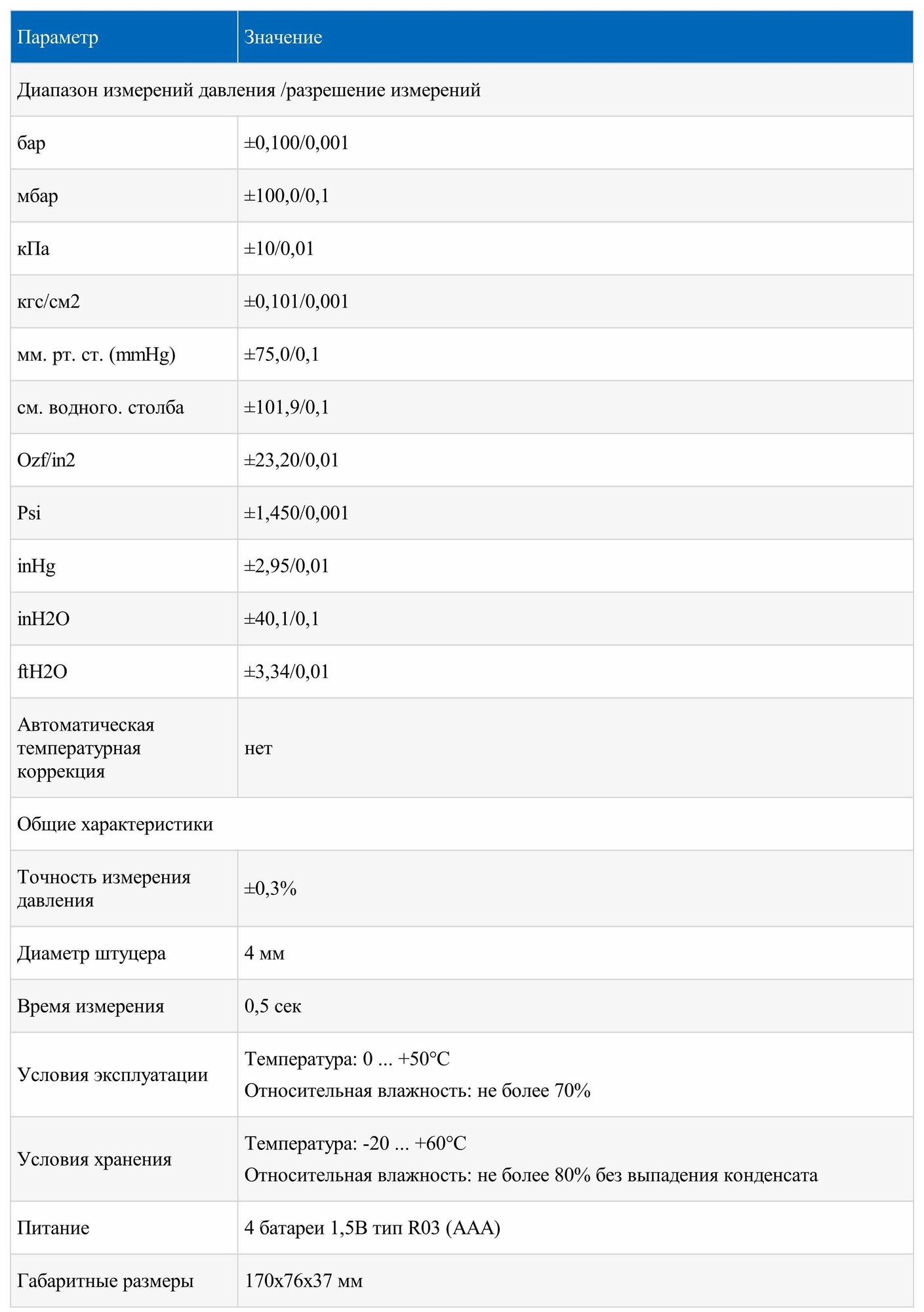 | Единицы измерения | Бар, МБар, кПа, кг-сила/см2, мм.рт.ст., см.водн.ст., унц-сила/дюйм2, фунт/дюйм2, дюйм рт.ст., дюйм водн.ст., фут водн. ст |