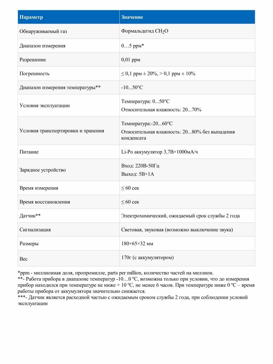 | Комплект поставки | 1. Измеритель концентрации формальдегида МЕГЕОН 08086 – 1 шт., 2. Аккумулятор 3,7В 1А/ч – 1 шт., 3. Пластиковый кейс для транспортировки и хранения – 1 шт., 4. Сетевое зарядное устройство с проводом – 1 шт., 5. Руководство пользователя – 1 экз., 6. Гарантийный талон – 1 экз. |