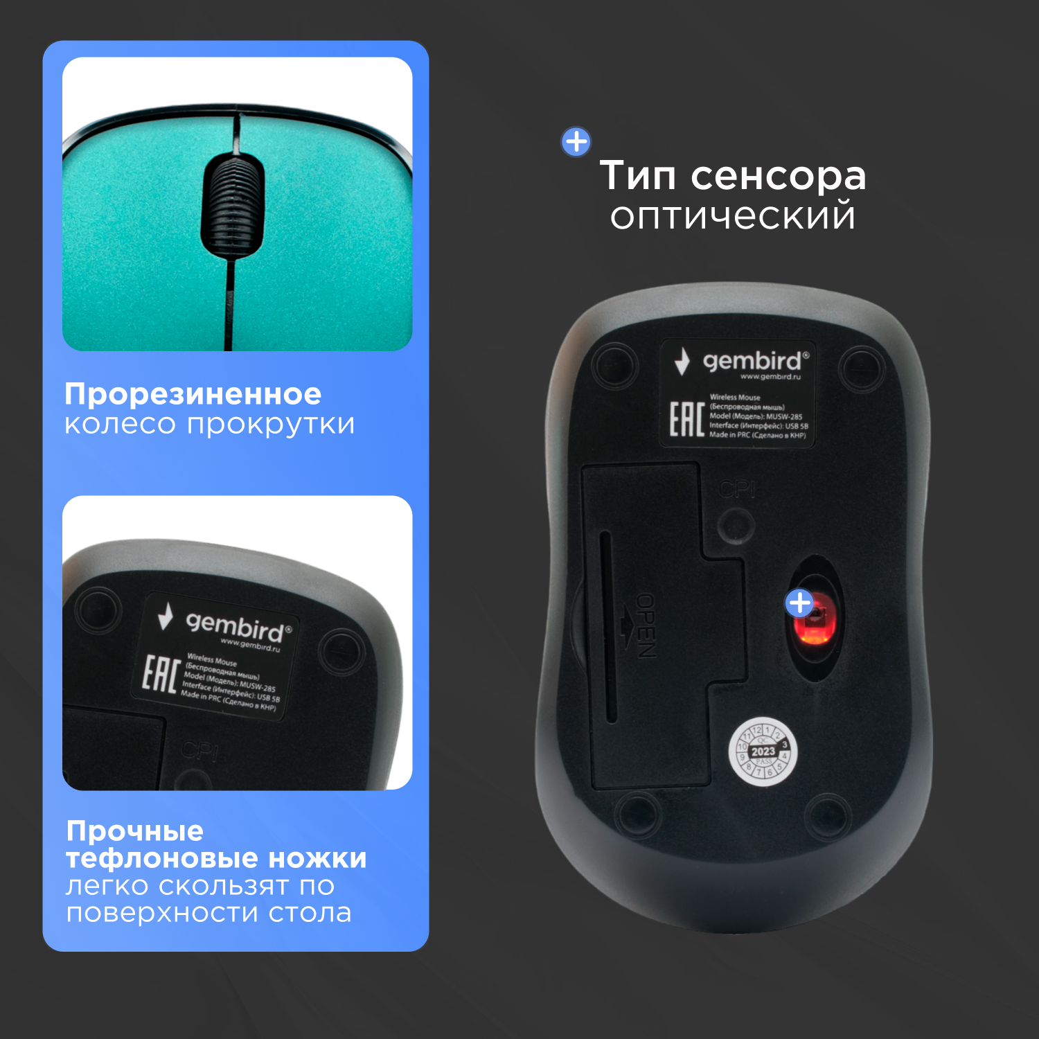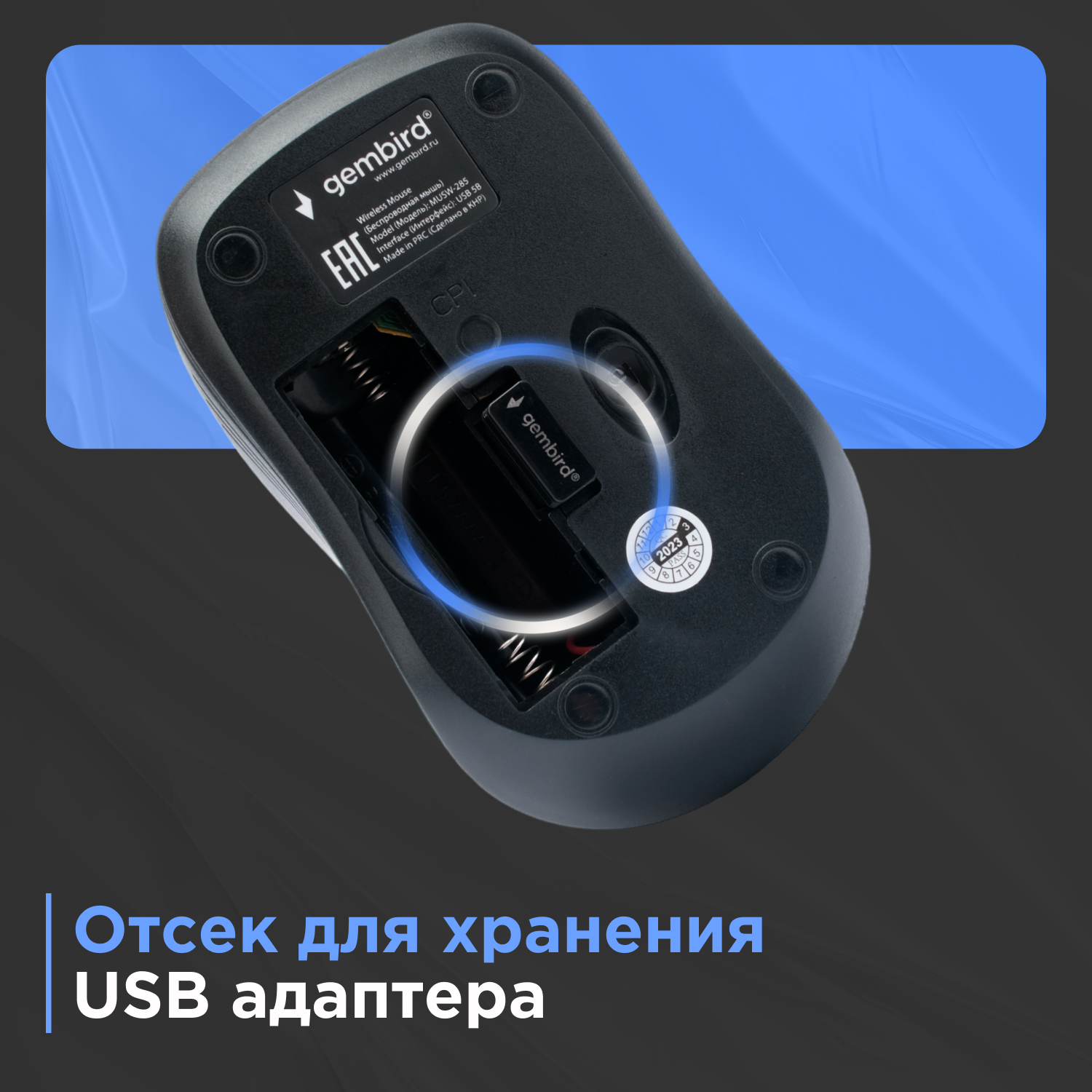 Gembird представляет собой классическую беспроводную оптическую мышь симметричной формы, благодаря чему ее одинаково удобно использовать как правой, так и левой рукой. Спинка манипулятора выполнена из качественного, приятного на ощупь пластика. Колесо прокрутки рельефное. Посредством ресивера USB представленная модель может быть подключена к персональному компьютеру или ноутбуку. Благодаря поддержке Plug-n-play, мышка быстро определяется и конфигурируется системой. Чувствительный оптический сенсор обеспечивает точное считывание перемещения практически по любой поверхности. Передача сигнала от мышки к ресиверу осуществляется на частоте 2.4 ГГц.