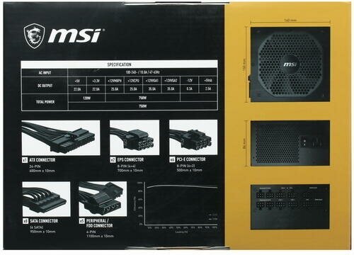 | Прочие особенности и свойства | Блок питания MSI MPG A750GF [MPG A750GF] станет отличным выбором для игровых систем и рабочих станций. Отличительной особенностью модели является высокий КПД и мощность в 750 Вт, за счет чего обеспечиваются широкие возможности для подключения разнообразных компонентов. Другой особенностью источника питания является высокая надежность, стабильность работы и безопасность использования, что обусловлено использованием первоклассных компонентов и передовых технологий. Кроме того, модель оснащена активным модулем охлаждения, который отличается высокой эффективностью и низким уровнем шума., Корпус MSI MPG A750GF выполнен в классическом ATX-формате с полностью разборной конструкцией, что вкупе с длинными кабелями в прочной оболочке обеспечивает удобство сборки системы. Для подключения комплектующих в модели используются стандартные разъемы для процессора, графики и других модулей. Поставка блока питания осуществляется в фирменной упаковке. |