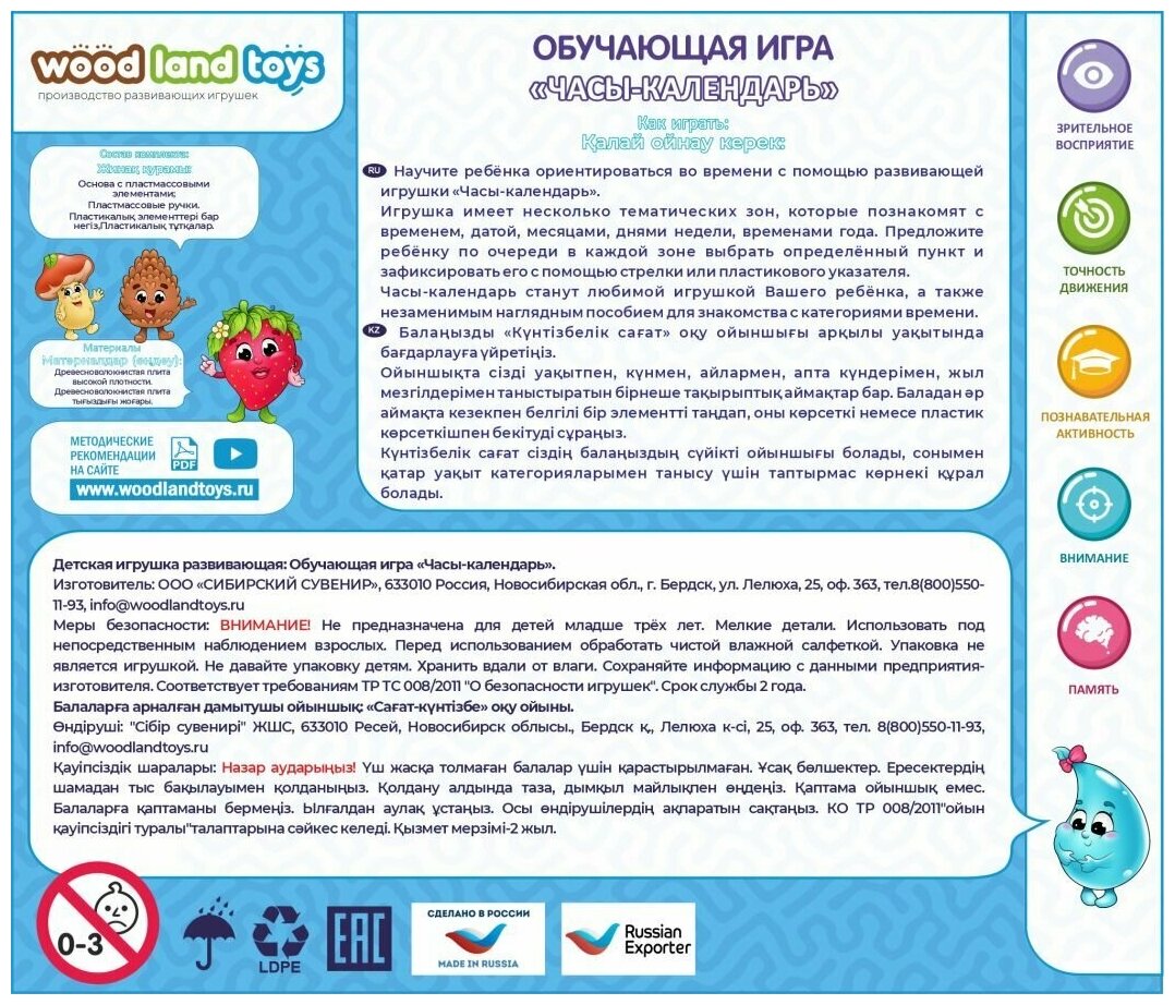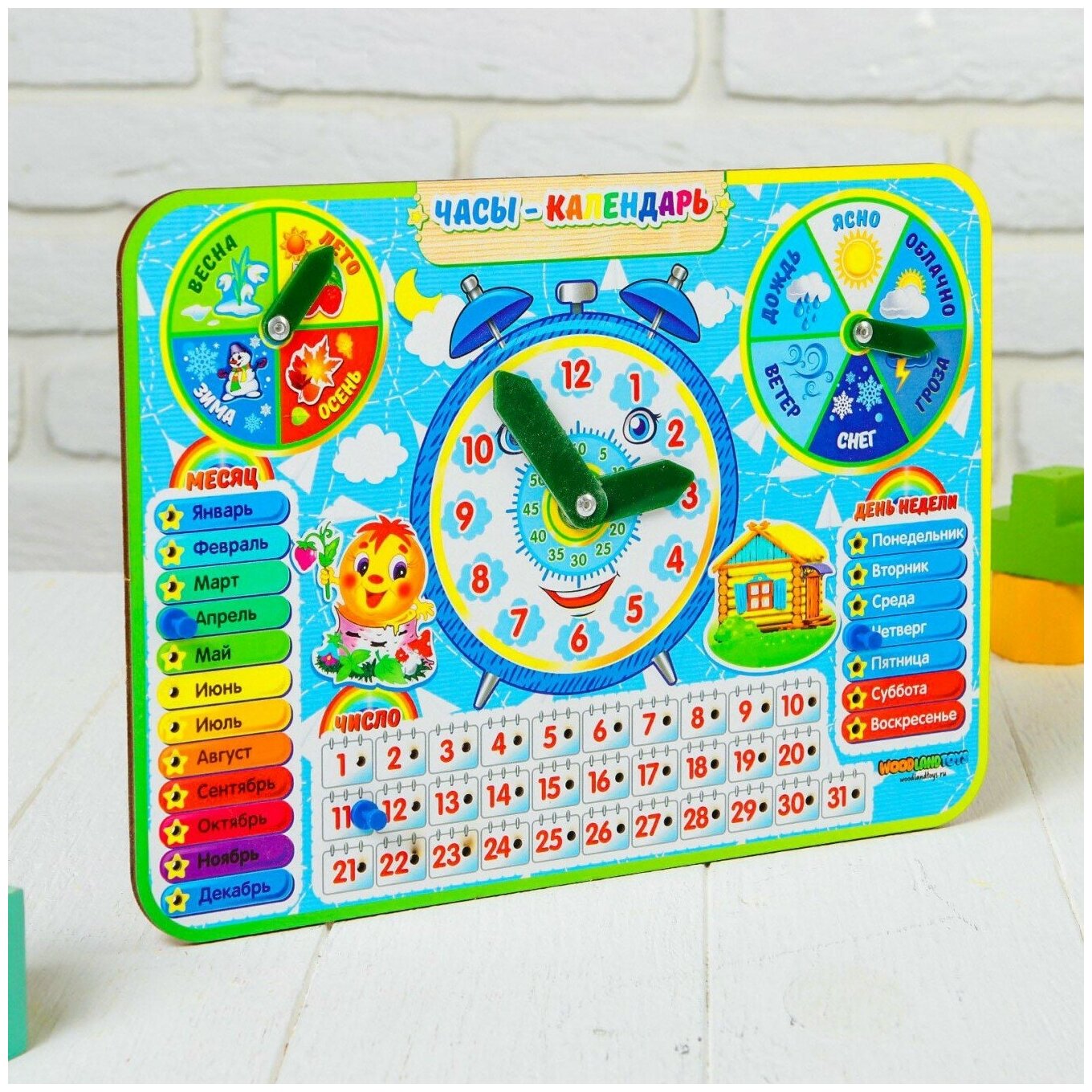 Игрушка представляет собой красочный деревянный планшет с подвижными стрелками и съемными пластиковыми деталями-указателями. Изображение разделено на несколько тематических зон, которые знакомят с временем, датой, месяцами, днями недели, временем года, погодными условиями.
