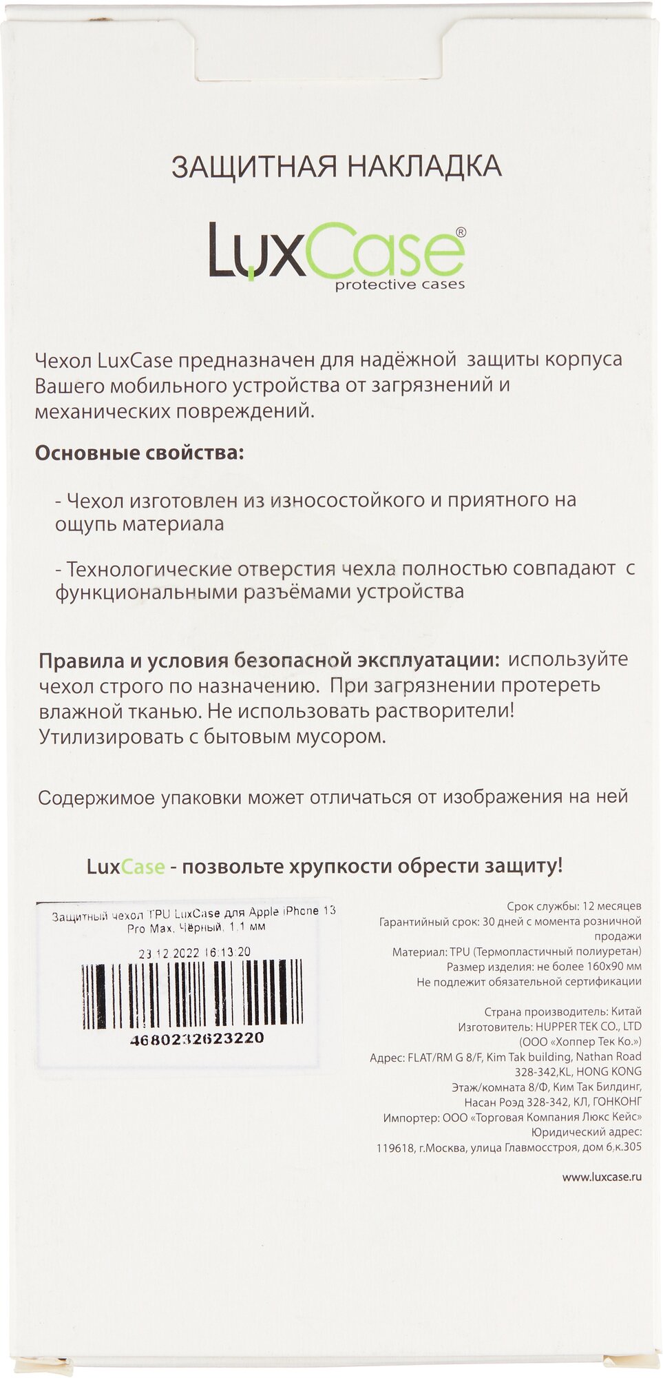 Чехол LuxCase предлагает дополнительную защиту для вашего Apple iPhone 13 Pro Max. Тонкий и лёгкий чехол удобно лежит в руке и достаточно прочен, чтобы защитить телефон от ударов и случайных царапин.