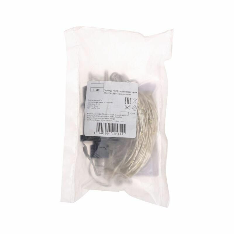 Светодиодная гирлянда «Роса» – прекрасный декоративный элемент, светящийся яркими огоньками и создающий атмосферу праздника и уюта. Данный вариант имеет большую длину и трансформатор для подключения в сеть с защитой IP44, что позволят использовать его и на улице. Гирлянда состоит из тонкого провода длиной 20 метров, с расположенными на нем 200 белыми долговечными светодиодами. Длина электрошнура 3 метра.