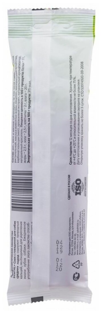 Профилактическое лакомство DENTAL+ Снек с говядиной для собак средних пород содержит природный кальций, необходимый для укрепления эмали зубов собаки. Ежедневное употребление этого лакомства способствует снятию мягкого зубного налета и снижению образования зубного камня у собаки.