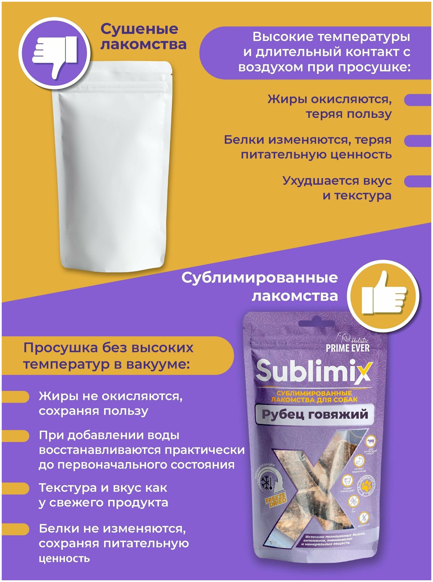 Prime Ever Sublimix - инновационные лакомства для собак, изготовленные с применением современной технологии сублимации, позволяющей сохранить максимум полезных свойств продукта. Натуральные лакомства - идеальный вариант для использования при дрессировке, поощрении вашего питомца. Нормы кормления: лакомства не должны составлять более 10% ежедневного рациона, следует обеспечить постоянный доступ к чистой воде.