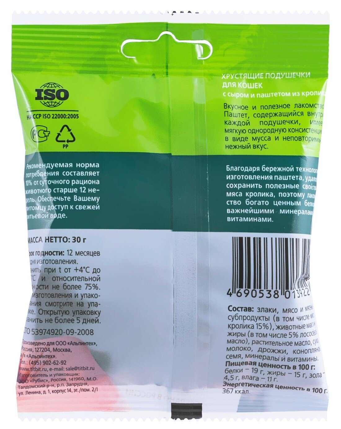 Хрустящие подушечки для кошек с сыром и паштетом из кролика – это вкусное и полезное лакомство. Паштет содержащийся внутри каждой подушечки имеет мягкую однородную консистенцию в виде мусса и неповторимый нежный вкус. Благодаря бережной технологии изготовления паштета, удалось сохранить полезные свойства мяса кролика, поэтому лакомство богато ценным белком, важнейшими минералами и витаминами.