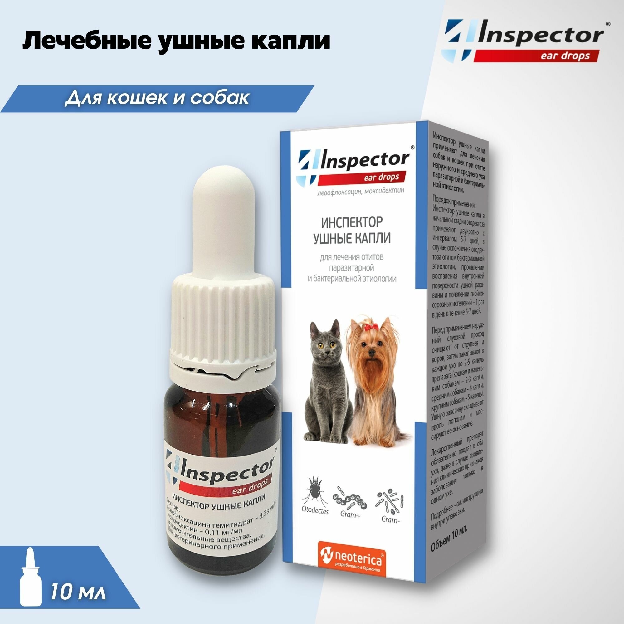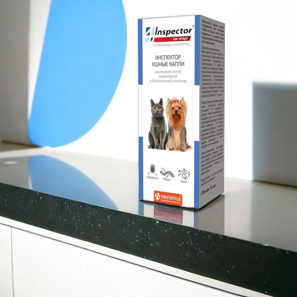 Инспектор ушные капли применяют для лечения собак и кошек при отите наружного и среднего уха паразитарной и бактериальной этиологии.Лечение самых распространенных заболеваний ушей (не требуется покупка нескольких препаратов):отодектоз (ушная чесотка);отиты бактериальной этиологии.Быстрый лечебный эффект в независимости от тяжести заболевания:моксидектин проникает глубоко в кожу, моментально уничтожая паразитов;левофлоксацин обеспечивает комплексный антибактериальный эффект;салициловая кислота снимает воспаление.Способ применения и дозыИнспектор ушные капли в начальной стадии отодектоза применяют двукратно с интервалом 5-7 дней, в случае осложнения отодектоза отитом бактериальной этиологии, проявлении воспаления внутренней поверхности ушной раковины и появлении гнойно-серозных истечений — 1 раз в день в течение 5-7 дней. Перед применением наружный слуховой проход очищают от струпьев и корок, затем закапывают в каждое ухо по 2-5 капель препарата (кошкам и маленьким собакам — 2-3 капли, средним собакам — 4 капли, крупным собакам — 5 капель). Ушную раковину складывают вдоль пополам и массируют ее основание. Если после применения препарата животное трясет головой, следует в течение нескольких минут фиксировать голову для предотвращения его разбрызгивания. Лекарственный препарат обязательно вводят в оба уха, даже в случае выявления клинических признаков заболевания только в одном ухе. При проведении лечебных процедур следует избегать попадания капельи в глаза животного. По окончании курса лечения, в случае обнаружении в соскобах (мазках) из наружного слухового прохода патогенной микрофлоры лечение животного продолжают 5-7 дней (до клинического выздоровления, подтвержденного лабораторными исследованиями) с использованием антибактериальных ушных капель в соответствии с инструкцией по ветеринарному применению.