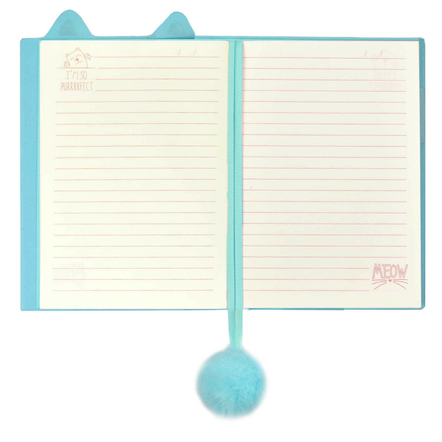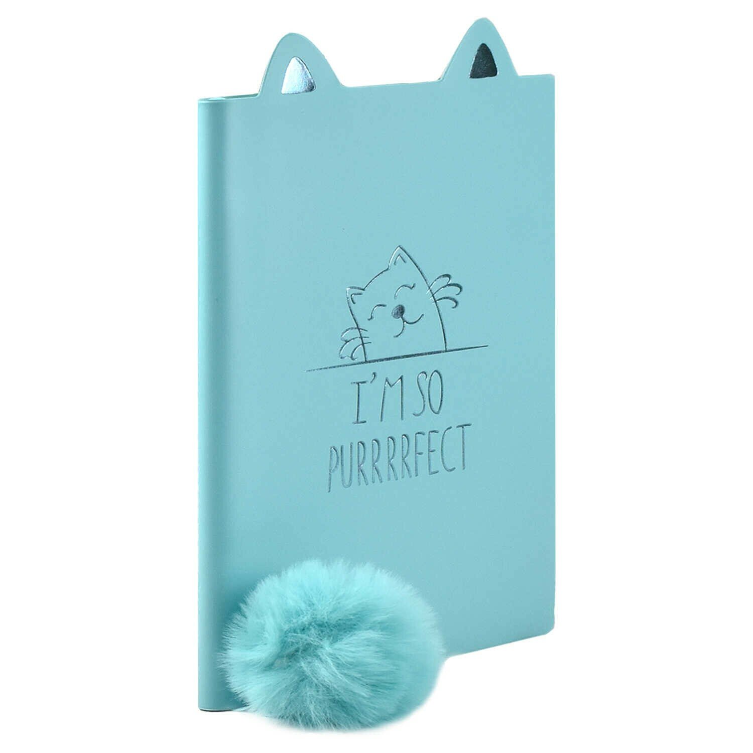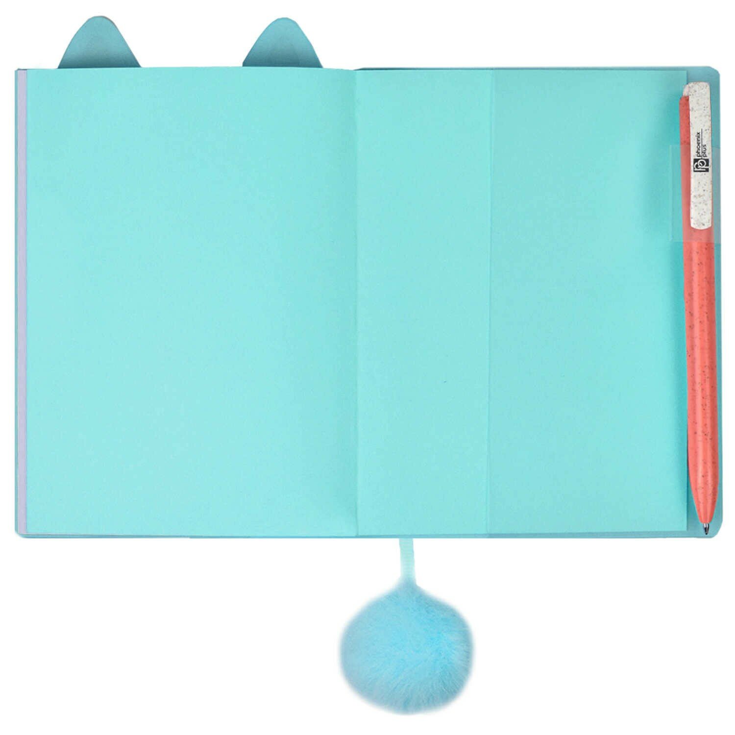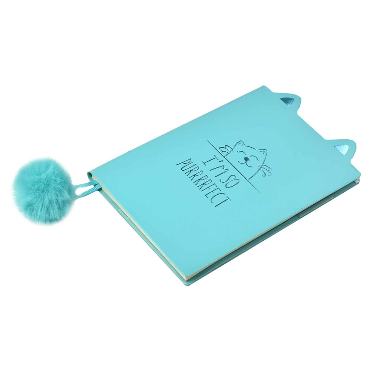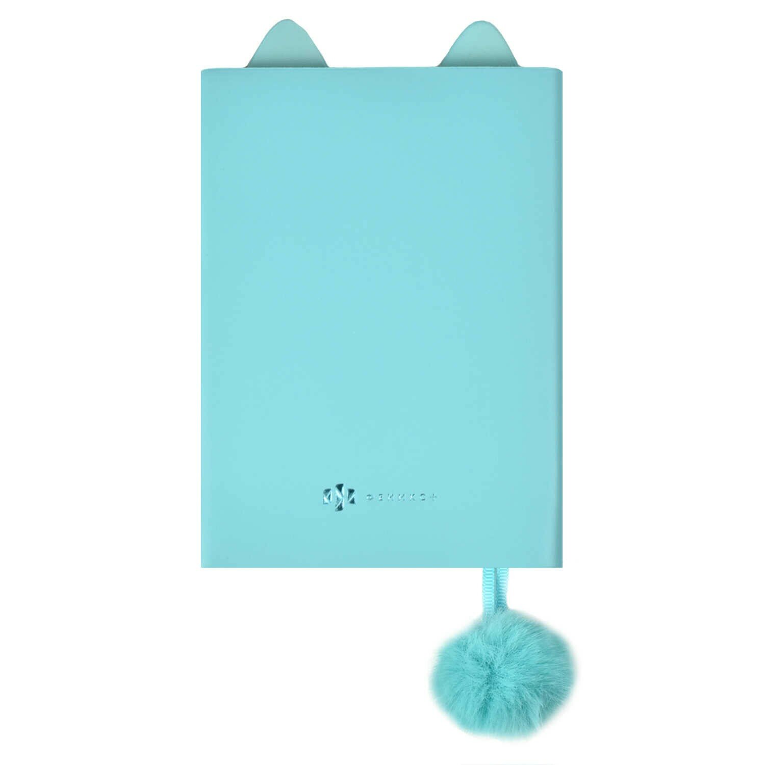Записная книжка голубого цвета, ближе к бирюзовому с кремовыми страницами. 48 листов в линейку с местом для обозначения даты на верху и закладкой с бубончикой на конце в качестве импровизированного хвостика. В конце на обложке есть петля для ручки. По размеру в высоту, примерно, 14 см., а в ширину 10 см. Продается в индивидуальной упаковке.
