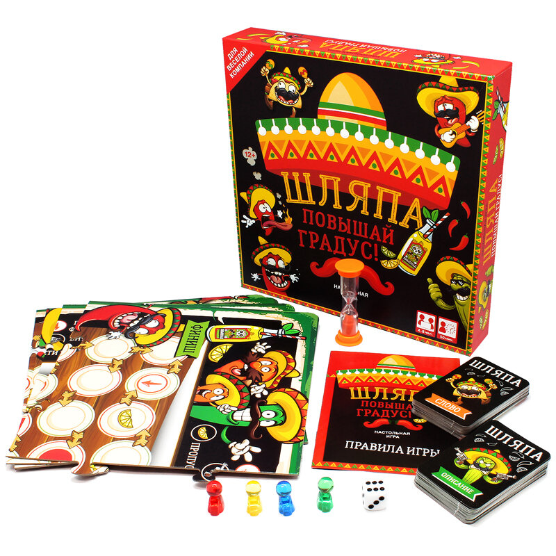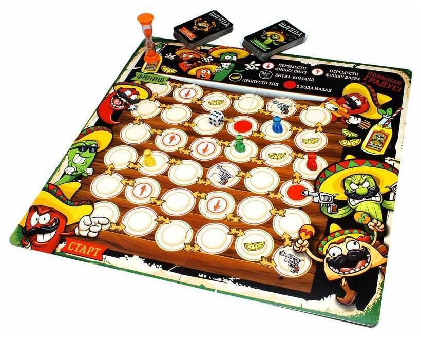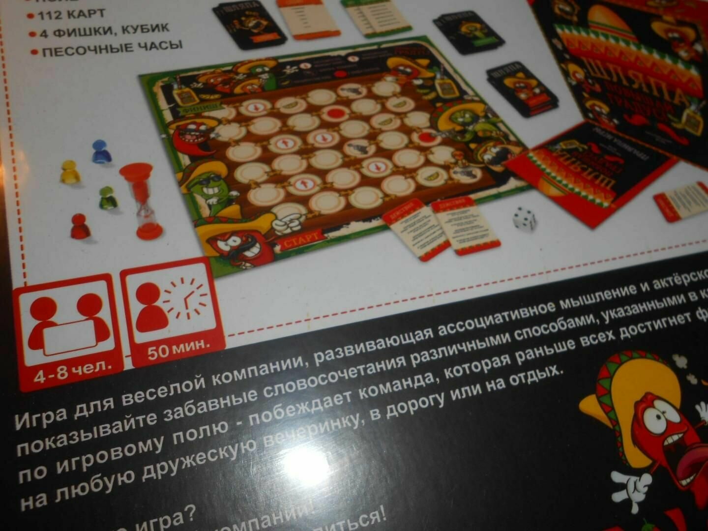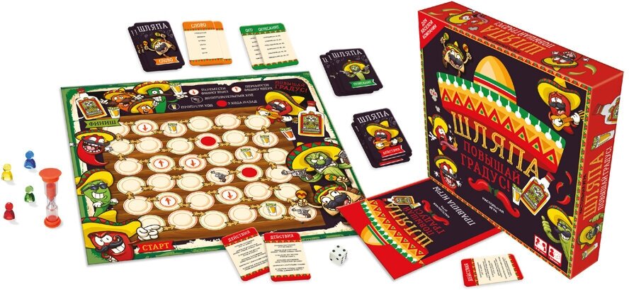 В наборе: поле-пазл, 112 карточек, правила, 4 фишки, кубик, песочные часы.