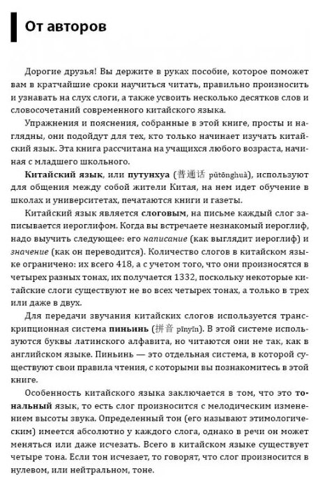 Очень толковое пособие, подойдёт даже для совсем новичков для самостоятельной работы. В нем есть подробные и понятные описания как произносить звуки китайского языка с опорой на примеры звучания в русском. В картинках показано положение языка при произнесении каждого звука. К упражнениям прилагаются аудиоматериалыдля прослушивания, доступные по QR-коду. Учебником удобно пользоваться, материал излагается понятно и доступно.