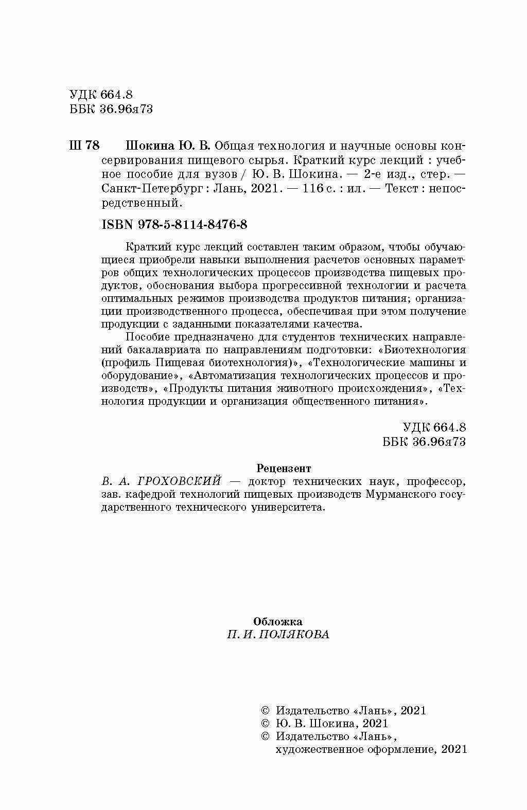 Общая технология и научные основы консервирования пищевого сырья. Краткий курс лекций (Шокина Юлия Валерьевна); Лань, 2021