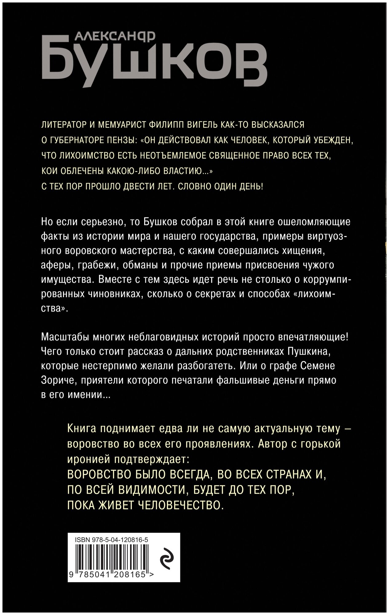 Но если серьезно, то Бушков собрал в этой книге ошеломляющие факты из истории мира и нашего государства, примеры виртуозного воровского мастерства, с каким совершались хищения, аферы, грабежи, обманы и прочие приемы присвоения чужого имущества. Вместе с тем здесь идет речь не столько о коррумпированных чиновниках, сколько о секретах и способах злодеяний.