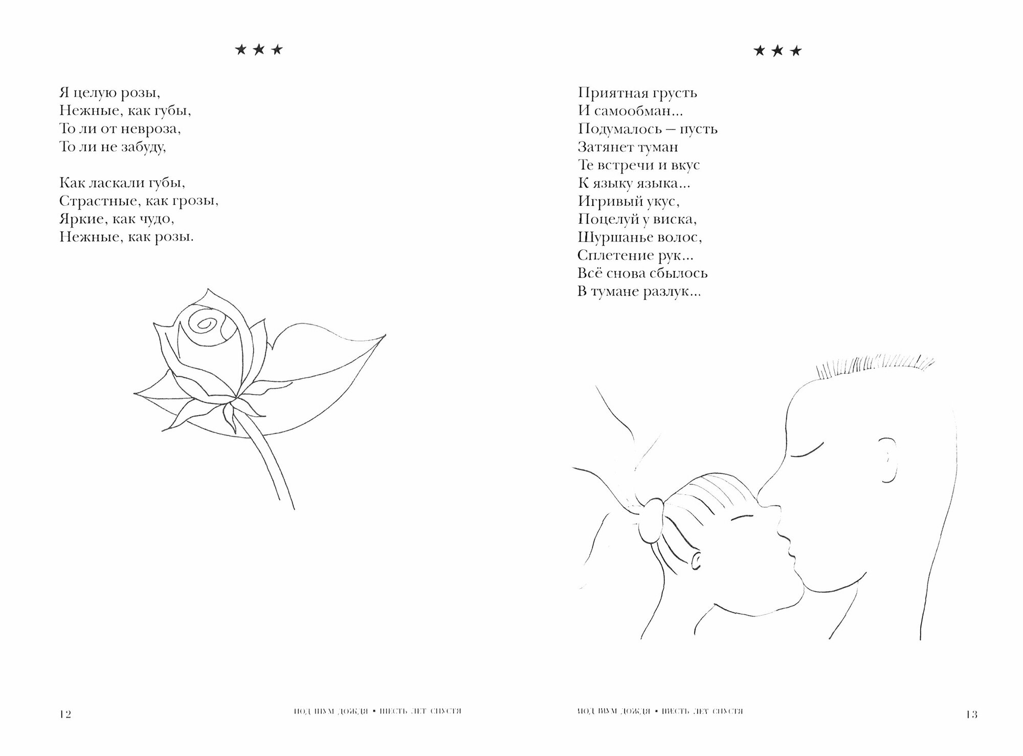 В сборнике три раздела - это три разных периода общения: при знакомстве, а затем 6 и 16 лет спустя, от момента знакомства. Необычные графические картинки, сделанные автором, обогащают восприятие.