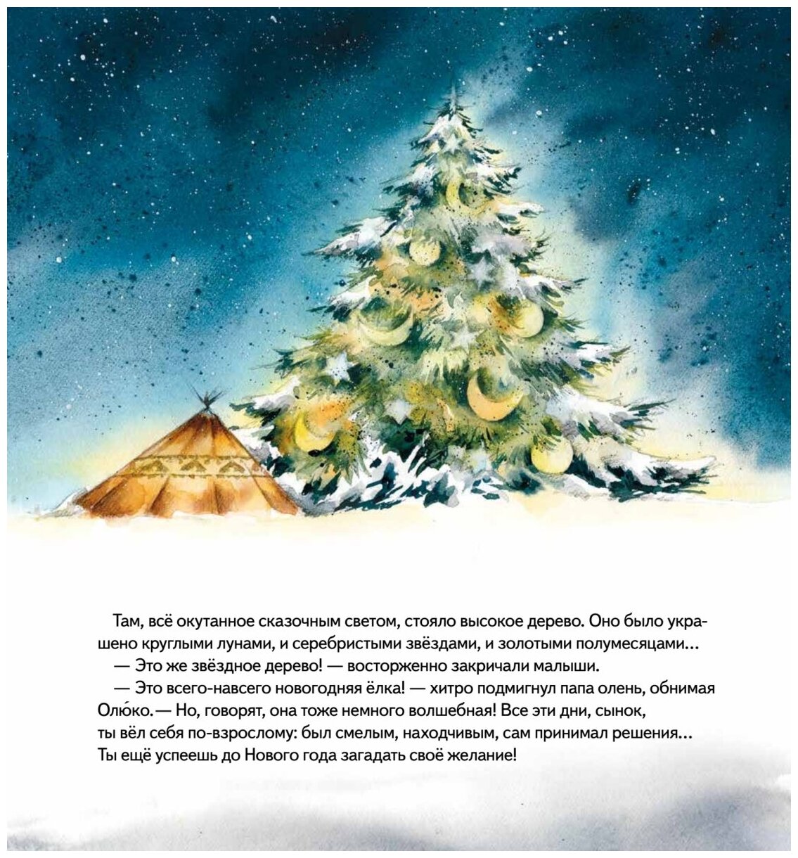 Оленёнок Олюко мечтает поскорее стать большим, чтобы носить такие же красивые ветвистые рога, как взрослые олени. Папа говорит, рога обязательно вырастут, как только Олюко научится быть смелым и решительным. Но ждать так тяжело! Проще загадать желание под волшебным звёздным деревом. И малыш отправляется вместе с друзьями на его поиски. Впереди оленёнка ждут отколовшаяся льдина, ночь в холодной и опасной тундре, спасение друзей и важное решение, от которого зависит - встретят ли они Новый год со своими семьями. Исполнится ли заветное желание Олюко? Об этом вы узнаете из доброй и волшебной истории. В книге вы найдёте не только новогоднюю сказку, но и полезную информацию об удивительном животном - северном олене.
