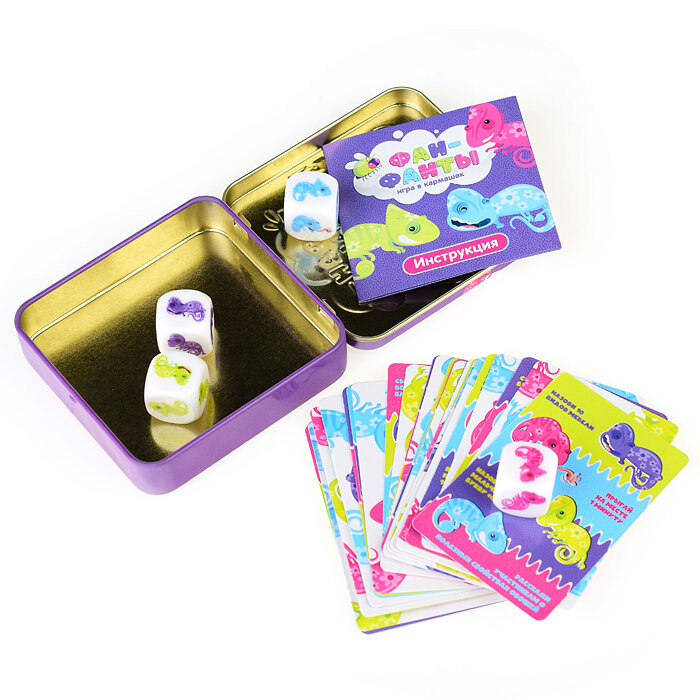 Настольная игра в жестяной коробочке "Фан-фанты" способствует развитию скорости реакции, внимательности и логики.