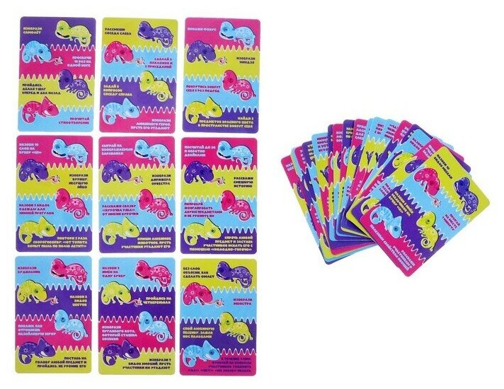 Нам понадобится колода карт и 1 кубик. Игроки по очереди бросают кубик и выполняют фант, который соответствует позе хамелеона. Если фант выполнен хорошо, то участник забирает карточку себе. Побеждает собравший большее количество карточек.