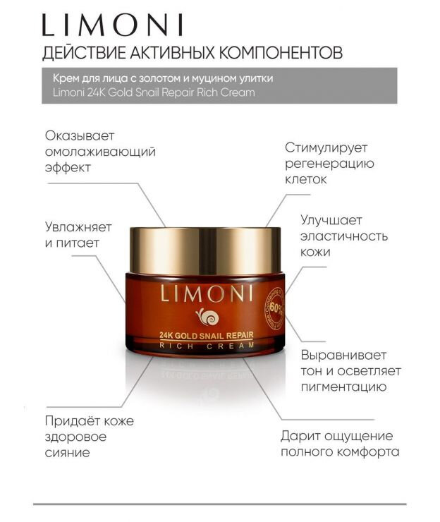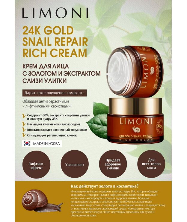 Крем для лица LIMONI 24K Gold Snail Repair Rich Cream – это современное средство с частицами золота, обладающее антивозрастным и лифтинговым эффектом. Он быстро увлажняет, придает коже естественный и здоровый внешний вид. Секреция улитки способна восстановить тонус, обеспечивая регенерацию клеток, уберегает кожный покров от воздействий солнца и мороза.