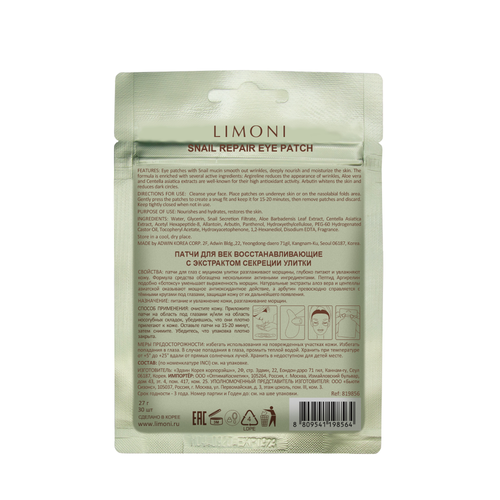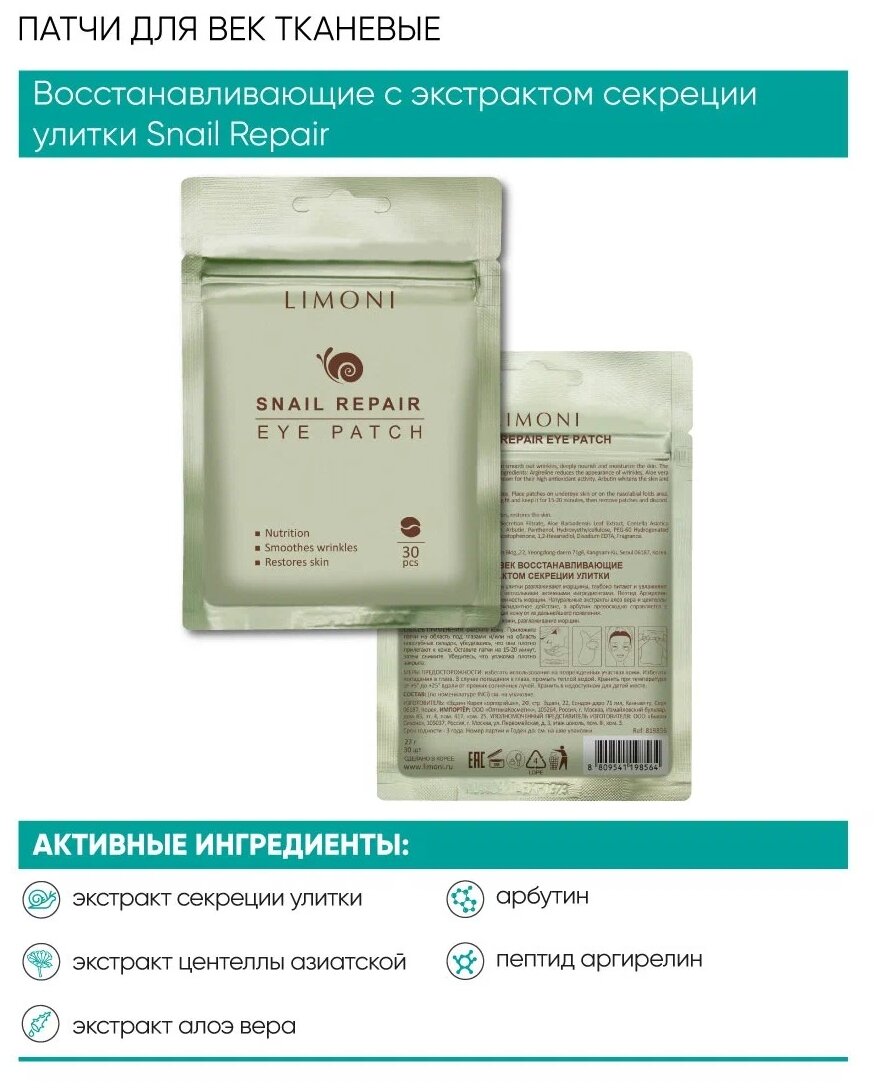 На сегодняшний день товар «Патчи для век восстанавливающие с экстрактом секреции улитки Snail Repair Eye Patch 30 шт Limoni COSON Co., Ltd (1526866)» можно купить с кешбеком в 1 магазине: Яндекс.Маркет