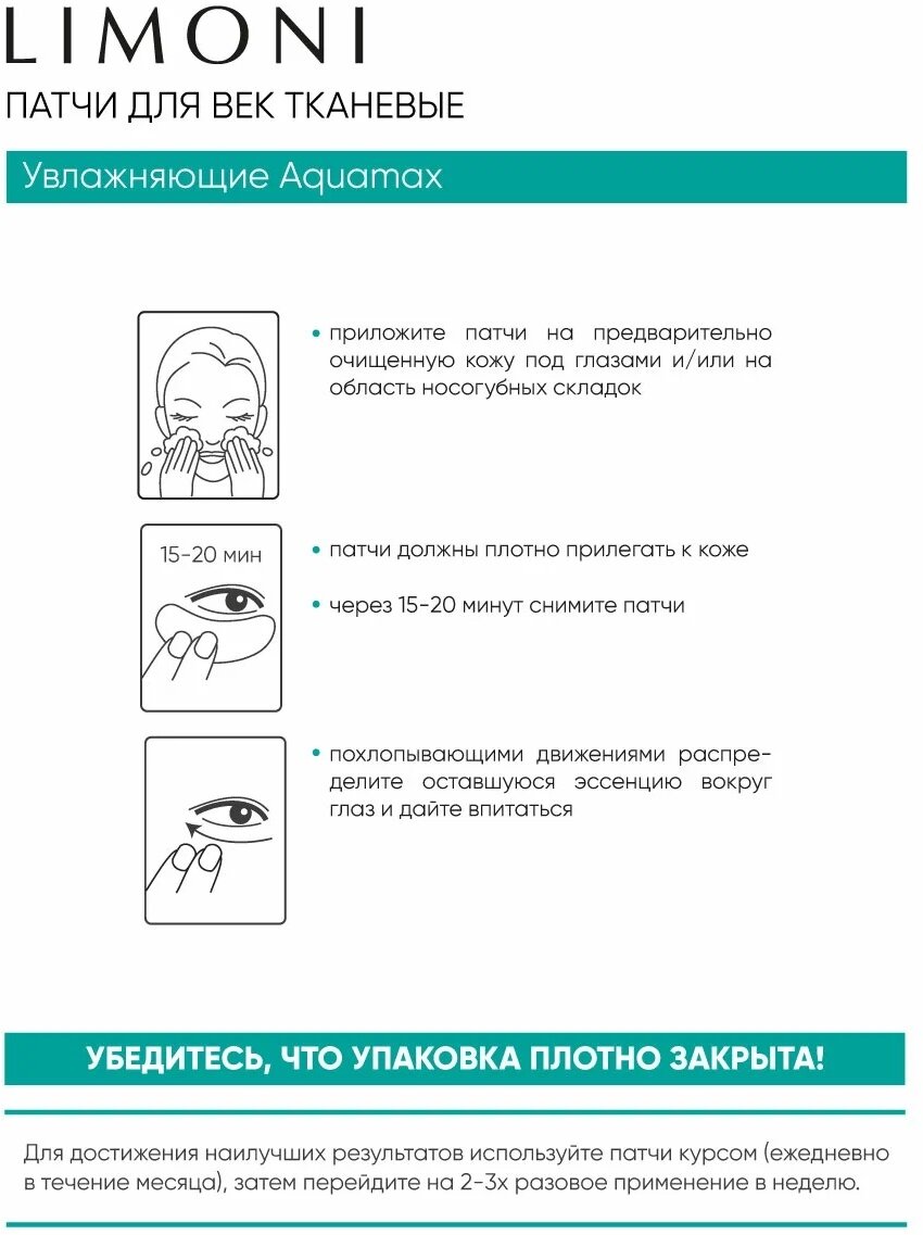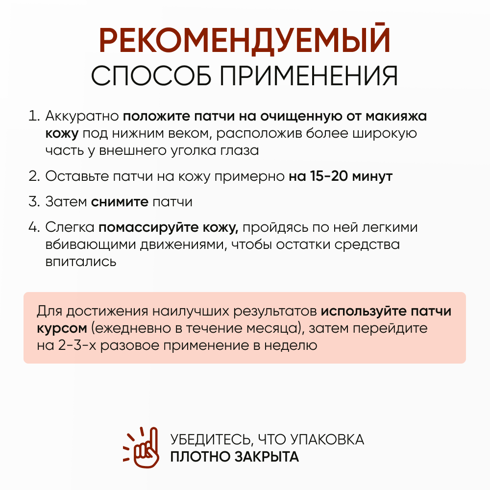 Патчи для глаз тканевые увлажняющие с термальной водой: Глубоко увлажняют кожу вокруг глаз. Устраняют обезвоженность. Осветляют темные круги под глазами. Замедляют проявление признаков старения. Питают кожу витаминами и микроэлементами. Способ применения: Приложите патчи на предварительно очищенную кожу под глазами, и/или на область носогубных складок. Они должны плотно прилегать к коже. Через 15-20 минут снимите патчи. Похлопывающими движениями распределите оставшуюся эссенцию вокруг глаз и дайте впитаться. Состав упаковки: 30 шт.