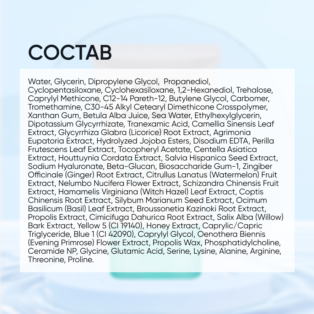 | Состав | Вода, глицерин, дипропиленгликоль, пропандиол, циклопентасилоксан, циклогексасилоксан, 1,2-гександиол, трегалоза, каприлилметикон, C12-14 Pareth-12, бутиленгликоль, карбомер, трометамин, C30-45, алкилметилметилметилцеллюлоз C30-45 , Сок Betula Alba, морская вода, этилгексилглицерин, двухкалиевый глицирризат, ароматизатор, транексамовая кислота, экстракт листьев камелии синезис, экстракт глицериды глабри (солодки), экстракт Agrimonia Eupatoria, гидролизованный ацетатноцитоз экоцита Экстракт центеллы азиатской, экстракт Houttuynia Cordata, экстракт семян шалфея испаноязычного, гиалуронат натрия, бета-глюкан, экстракт корня глицирризы (солодка), экстракт биосахарида камеди-1, экстракт корня Zingiber Officinale (имбирь), плод цитруллы, плоды латунированного дерева (Lanutus) Экстракт цветков Nucifera, экстракт плодов лимонника китайского, экстракт листьев гамамелиса виргинского (гамамелиса), экстракт корня Coptis Chinensis, силибум мар экстракт семян иана, экстракт листьев Ocimum Basilicum (базилика), экстракт корня Broussonetia Kazinoki, экстракт прополиса, экстракт корня Cimicifuga Dahurica, экстракт коры Salix Alba (ивы), желтый 5 (CI 19140), экстракт меда, каприловый / каприновый триглицерид, синий 1 (CI 42090), каприлилгликоль, Oenothera Biennis (экстракт вечерней примулы), воск прополиса, фосфатидилхолин, церамид NP, глицин, глутаминовая кислота, серин, лизин, аланин, аргинин, треонин, пролин. |
