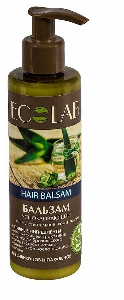В производстве использованы только натуральные консерванты и красители. Бальзам для волос Бережный уход от Эколаб содержит: Органический экстракт алое вера обладает увлажняющим и успокаивающим действием на кожу, стимулирует процессы естественной регенерации, поддерживает оптимальный водный баланс. Экстракт мальвы обладает антиоксидантными и смягчающими свойствами, понижает порог чувствительности кожи и восстанавливает её комфортное состояние. Органическое масло оливы питает корни волос. Масло бразильского ореха восстанавливет структуру волос и хорошо увлажняет кожу головы.