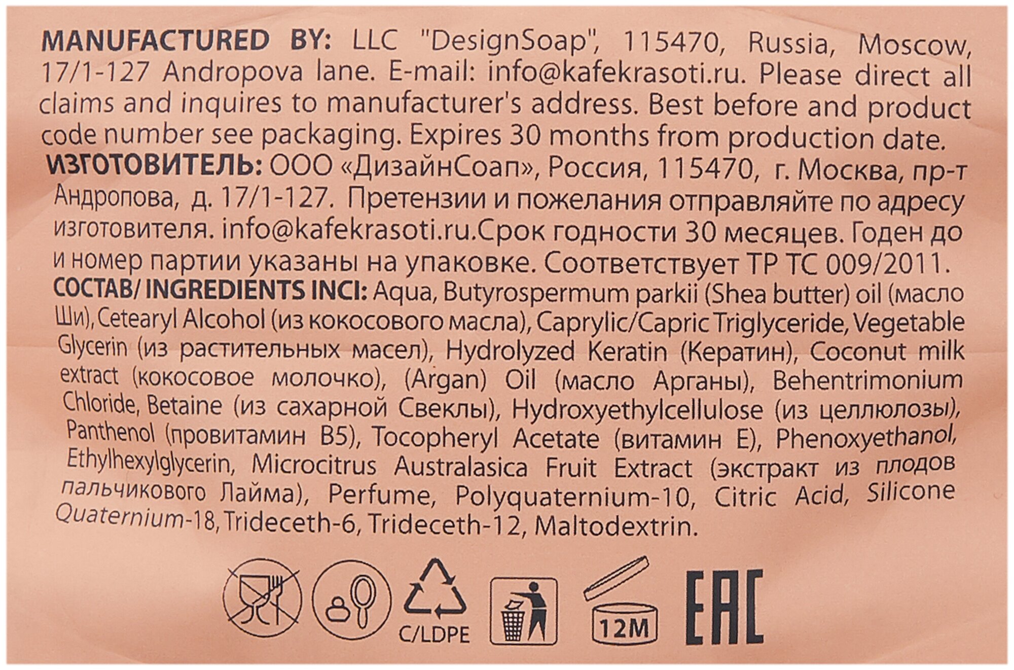 | Состав | aqua, butyrospermum parkii (shea butter) oi, argania spinosa (argan) oil, cetearyl аlcohol (из кокосового масла), caprylic/capric triglyceride, vegetable glycerin, hydrolyzed keratin, coconut milk extract, behentrimonium chloride, betaine, hydroxyethylcellulose, panthenol, tocopheryl acetate, phenoxyethanol, ethylhexylglycerin, microcitrus australasica fruit extract, perfume, polyquaternium-10, citric acid, silicone quaternium-18, trideceth-6, trideceth-12, maltodextrin. |
