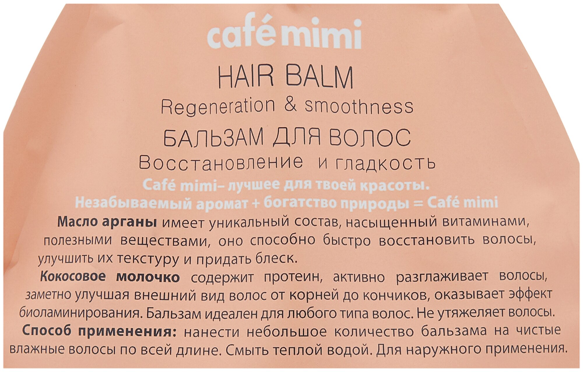 Бальзам для волос Cafemimi Восстановление и гладкость с маслом арганы, которое быстро восстанавливает волосы, улучшает их текстуру и усиливает блеск, и кокосовым молочком, оказывающим эффект биоламинирования. Бальзам идеален для любого типа волос. Не утяжеляет волосы.
