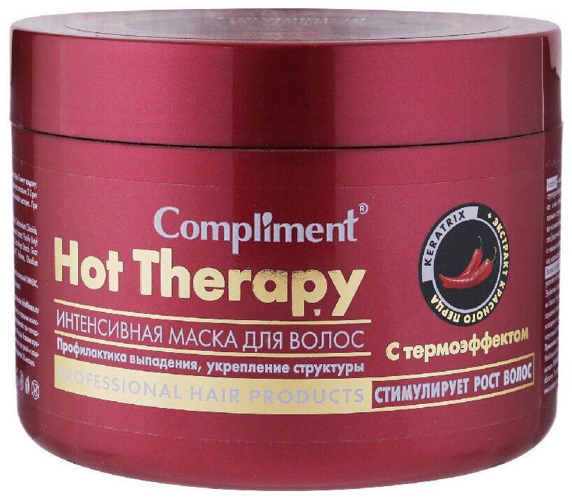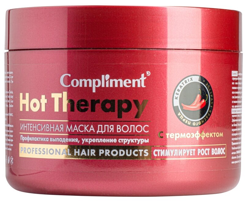 Маска для волос Compliment Hot Therapy базируется на многофункциональном комплексе Keratrix из семян рожкового дерева. Keratrix влияет как на внешний вид, так и на эластичность волос, устойчивость к ломке. Экстракт кайенского красного перца, входящий в состав улучшает кровообращение, укрепляет волосы, стимулирует их рост.
