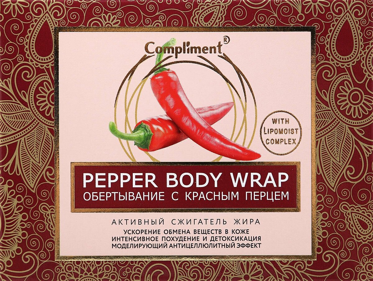 Процедуры обертывания с красным перцем от компании Compliment благодаря термо-эффекту усиливают действие активных компонентов, улучшают кровообращение в проблемных зонах, ускоряют расщепление жировых отложений и влияют на укрепление тканей. Уменьшаются проявления целлюлита, а кожа становится подтянутой, мягкой и гладкой.