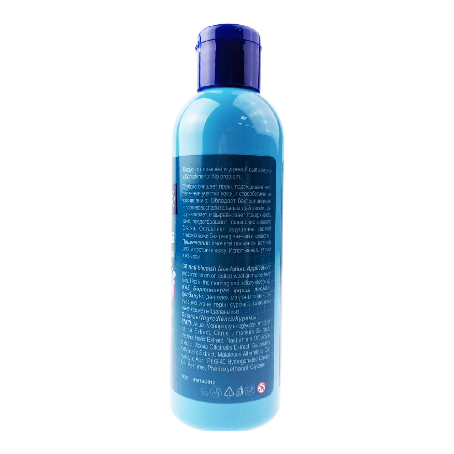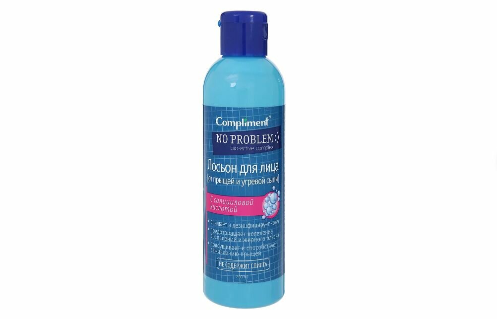 Описание товара:Лосьон для лица Compliment No problem с салициловой кислотой 200 мл. Очищает и дезинфицирует кожу. Предотвращает появление воспалений и жирного блеска. Подсушивает и способствует заживлению прыщей. Не содержит спирта. Глубоко очищает поры, подсушивает воспаленные участки кожи и способствует их заживлению. Обладает бактерицидным и противовоспалительным действием, оздоравливает и выравнивает поверхность кожи, предотвращает появление жирного блеска. Оставляет ощущение свежести чистой кожи без раздражений и сухости. Bio-active complex- специально разработанная система компонентов, эффективно борющихся с такими проблемами кожи как: черные точки, угри, прыщи и воспаления. В основе комплекса активные антибактериальные и растительные добавки, которые очищают кожу, устраняют недостатки и предотвращает их повторное появление. И больше - нет проблем! ГОСТ 31679-2012.Состав товара:Aqua, Monopropyleneglycole, Arctium Lappa Extract, Citrus Limonium Extract, Hedera Helix Extract, Nasturnium Officinale Extract, Salvia Officinalis Extract, Saponaria Officinalis Extract, Malaleuca Alternifolia Oil, Salicylic acid, PEG-40 Hydrogenated Castor Oil, Perfume, Phenoxyethanol, Glycerin.Меры предосторожности:Хранить в недоступном для детей и защищённом от прямых солнечных лучей месте.Способ применения:Смочите лосьоном ватный диск и протрите кожу. Использовать утром и вечером.