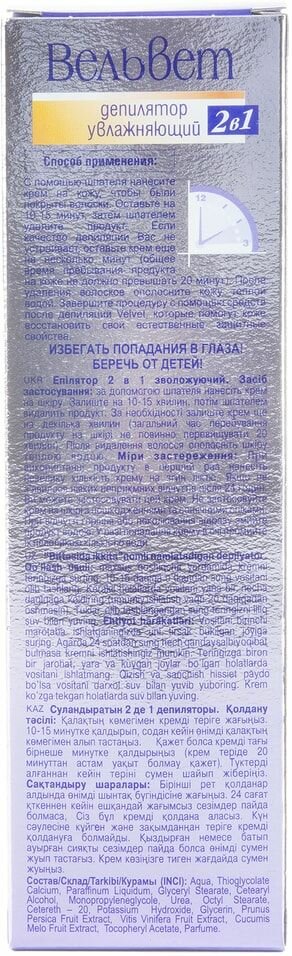 | Способ применения | С помощью шпателя нанесите крем на кожу, чтобы были покрыты волоски. Оставьте на 10-15 минут, затем шпателем удалите продукт. Если качество депиляции Вас не устраивает, оставьте крем ещё на несколько минут (общее время пребывания продукта на коже не должно превышать 20 минут). После удаления волосков ополосните кожу тёплой водой. Завершите процедуру с помощью средств после депиляции Velvet, которые помогут коже восстановить свои естественные защитные свойства. |