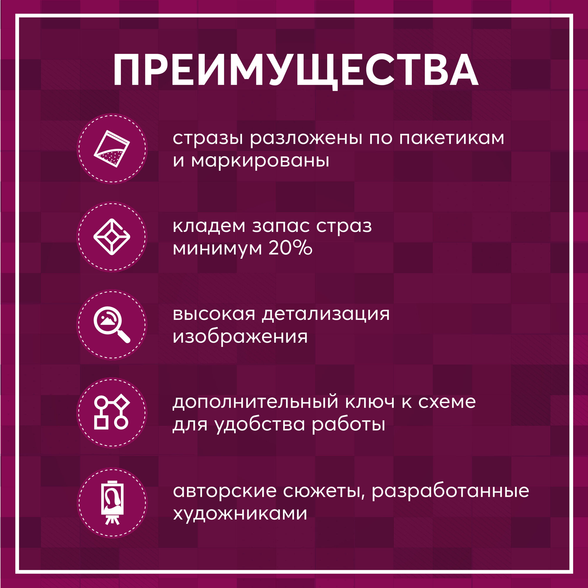 | В набор входит | холст с клеевой основой и цветосимвольной схемой, два лотка, пинцет в мягком чехле, стилус, воск, маркированные пакетики со стразами |