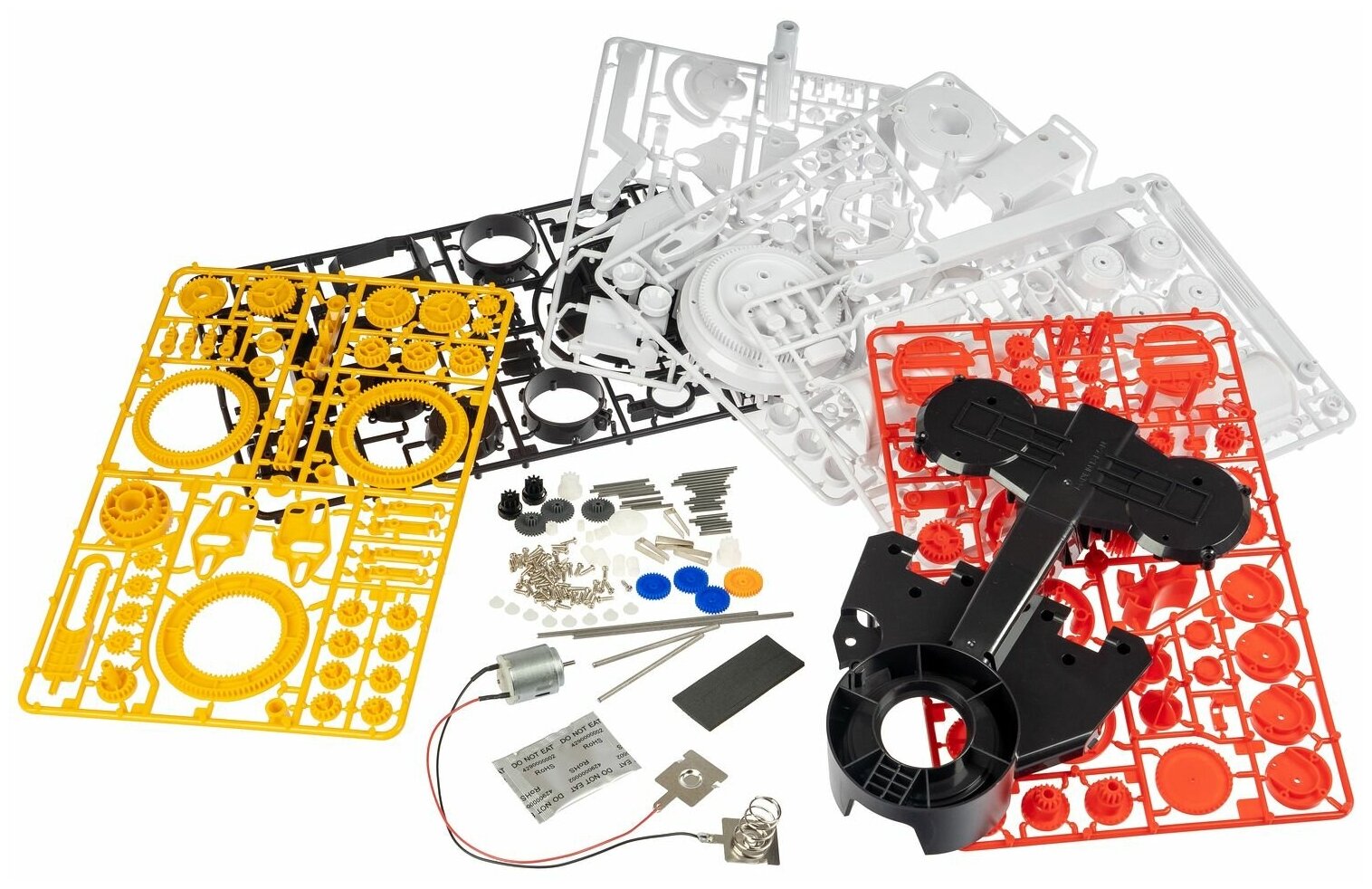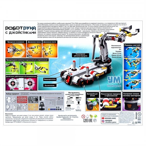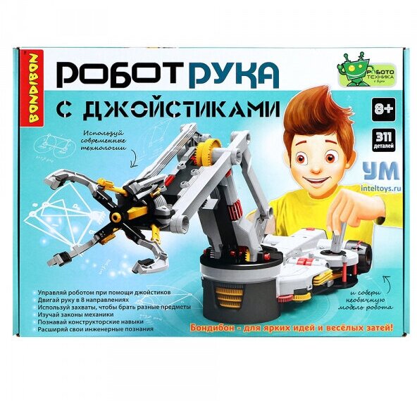 Робототехника с Буки позволяет каждому почувствовать себя создателем искусственного интеллекта, ведь робота необходимо собрать самому! Робот рука с джойстиками от Bondibon определенно тебя заинтересует!Сними блокировку, нажав на кнопку предохранителя, включи, и Рука сразу же перейдет в режим ожидания.Гул мотора и шелест вращающихся шестеренок говорят о том, что тебя ждет увлекательная игра. Ты легко освоишь управление двумя джойстиками — они контролируют 4 оси, которые позволяют руке двигаться в 8 разных направлениях.С помощью захватов с 2 и 4 когтями, ты сможешь брать самые разные предметы. Ты даже сможешь сделать свой собственный игровой автомат — кран-машину Хватай-ка! Максимальный подъемный вес - 50 грамм. Набор для опытов соответствует высоким стандартам качества Бондибон и содержит 311 деталей и подробную инструкцию по сборке. Дополнительно понадобятся: 2 элемента питания D, ватная палочка, стакан, бокорезы, крестовая отвертка, бумажные полотенца. Возраст: 8+