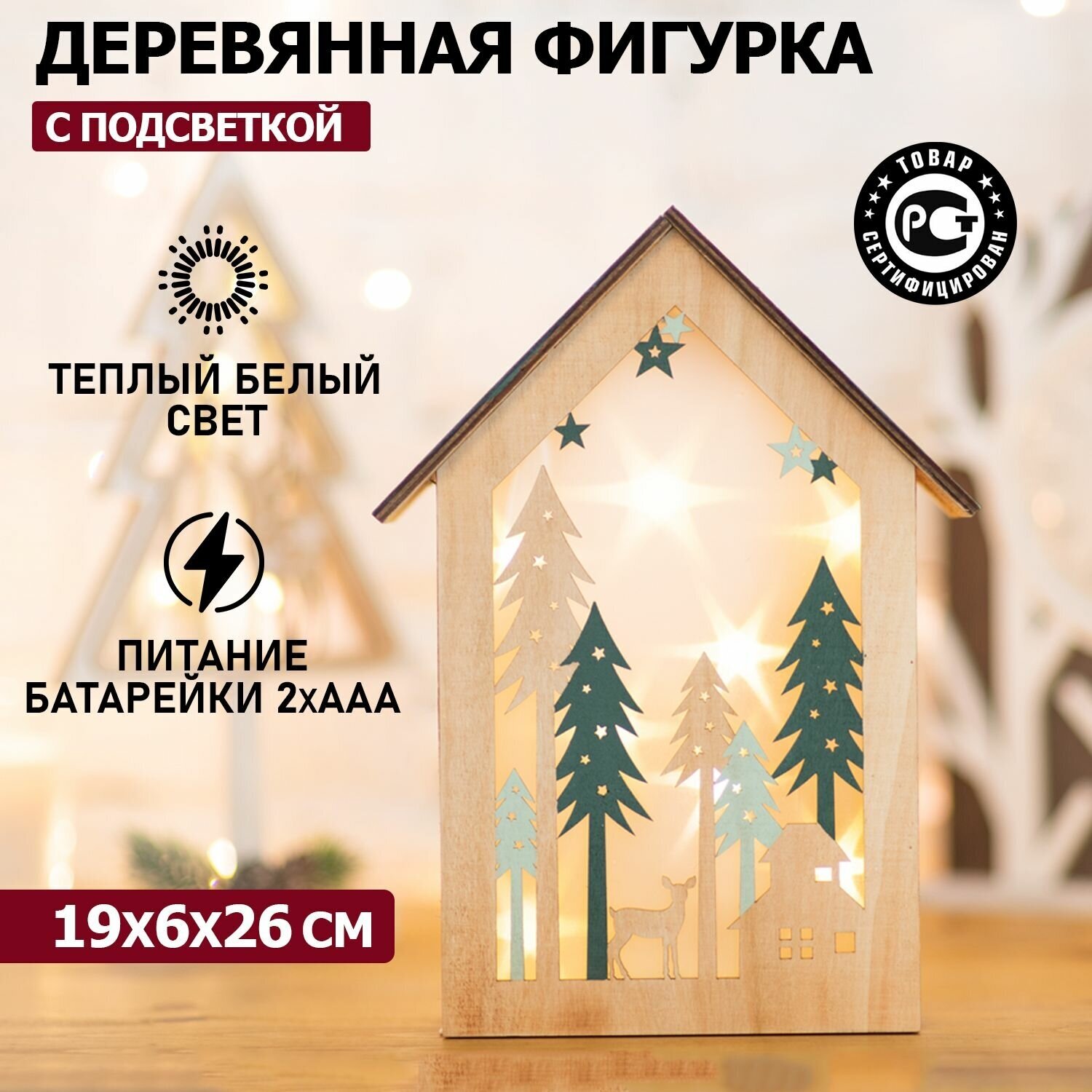 Деревянная фигурка на батарейках со светодиодной подсветкой дополнит интерьер в повседневный и праздничный период. Устойчивая подставка позволит разместить изделие практически везде. Украсит детскую, гостиную, комод или полку. Сделана из натуральной древесины, окрашена безопасным составом.