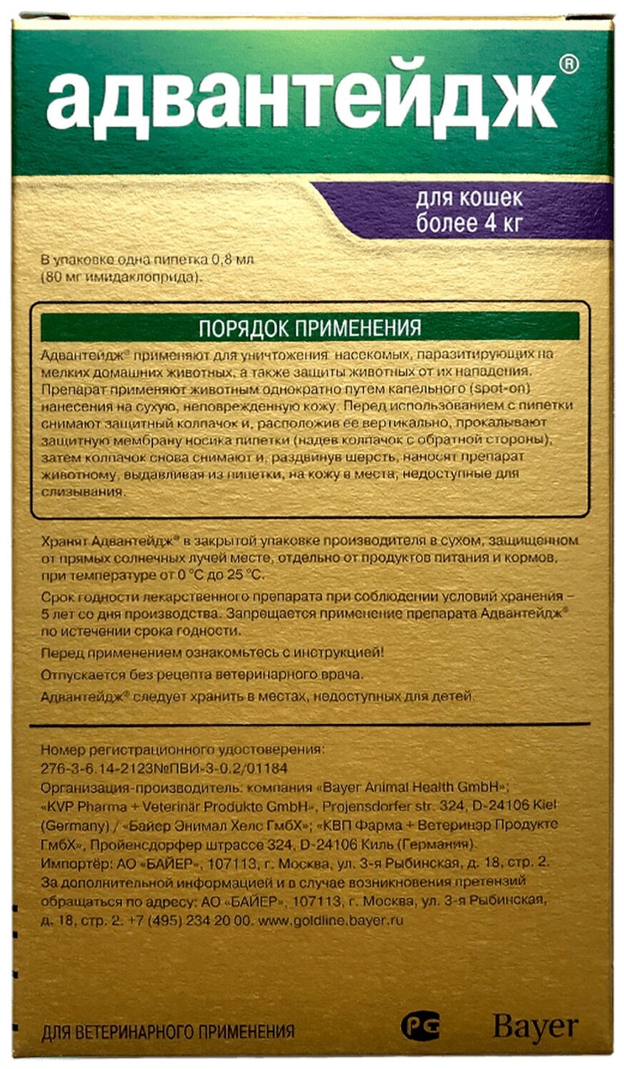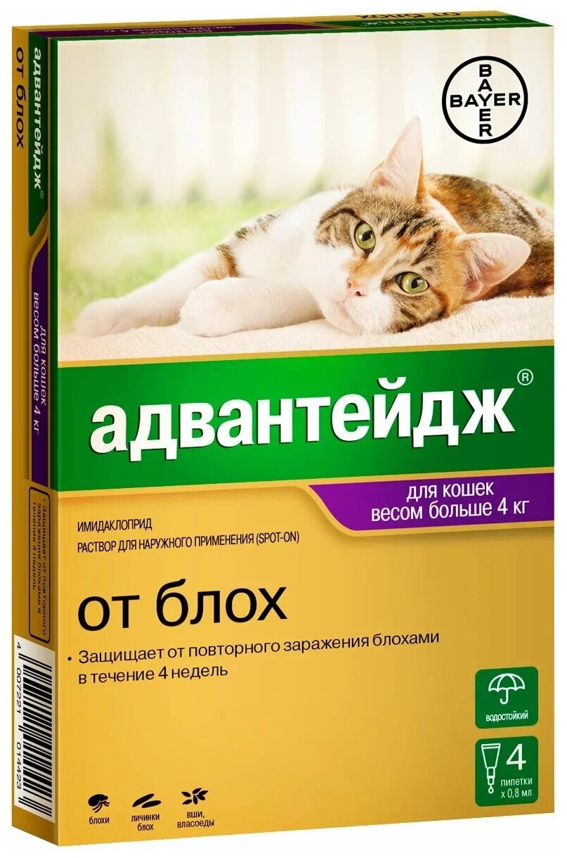 Капли на холку Адвантейдж® - продукт, помогающий вам защитить кошку от от блох, вшей и власоедов. Капли Адвантейдж® распределяются по шерсти и коже кошки и избавляют животное от блох, а также препятствуют повторному заражению блохами в течение 28 дней после применения препарата.Достоинства:u избавление от блох на животном происходит в тот же день когда применили капли. Капли наносятся на холку – на кожу между лопатками, у основания шей, в место недоступное для слизывания.u защищают от заражения блохами в течение 28 дней после применения препарата.u снижают количество укусов блох уже через 3-5 минут после контакта блох с препаратом. Действие препарата заключается в парализации блох еще до того, как паразиты успеют укусить.u действуют на блох, находящихся в окружающей среде, что позволяет избавиться от уже отложенных личинок блох, которые могут находиться повсюду, где любит находиться кошка.Характеристика:u капли на холку от блох, вшей, власоедовu котятам и кошкам весом от 4 до 8 кгu разрешен котятам с 10 недельного возрастаu разрешен всем породам кошекu в упаковку вложены наклейки для паспорта животногоu срок годности 5 летu производитель Elanco, Германия