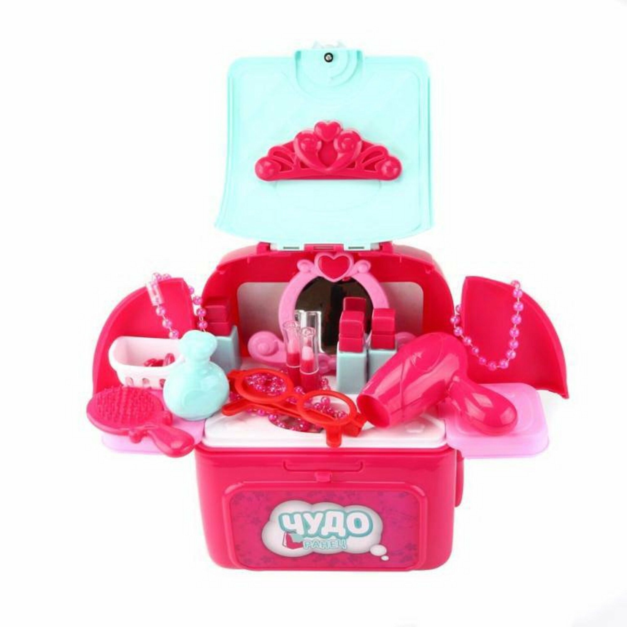 Комплектация набора: ранец пластиковый - 1шт, ремень текстильный для переноски ранца на спине- 1 шт, навесные полки - 3 шт, зеркало (пластик) - 1шт, столешница - 1шт, декоративный элемент для крышки набора - 1 шт, фен - 1шт, расческа - 1шт, косметические флакончики - 4 шт, игрушечная помада - 2 шт, колечки - 3 шт, бусы - 1 шт, браслет - 1 шт.