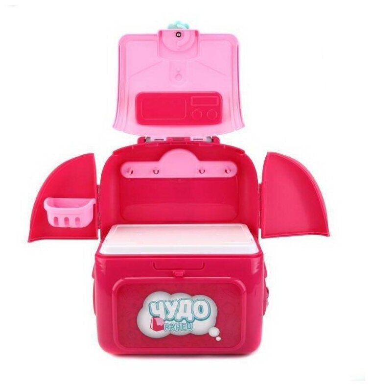 Комплектация набора: ранец пластиковый - 1шт, ремень текстильный для переноски ранца на спине- 1 шт, навесные полки - 2шт, навесная раковина - 1шт, водопроводный кран - 1шт, панель- "электроплитка" - 1шт, панель с крючками - 1шт, часы-приемник - 1шт, кастрюля с крышкой - 1 шт, сковорода с крышкой - 1шт, чашка - 2 шт, блюдце - 2шт, столовые приборы - 3 шт, кухонные приборы - 4 шт, бутылочки с продуками - 2 шт, продукты - 3шт.