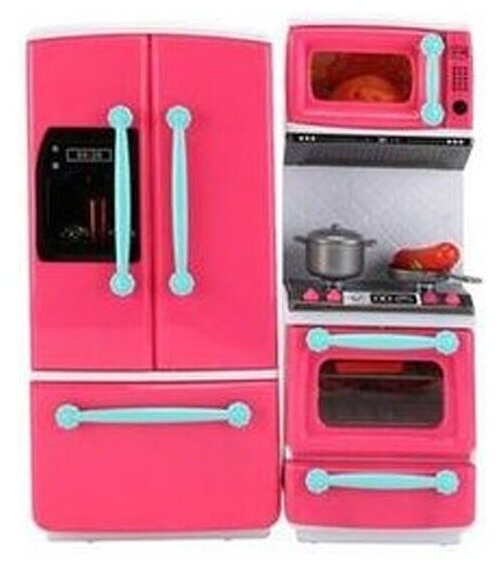 Кухонный гарнитур представляет собой прекрасно детализированный игровой набор, состоящий из плиты, духового шкафа, микроволновой печи, двухстороннего холодильника с выдвижным ящиком, множества кухонных принадлежностей и продуктов. При нажатии на одну из конфорок включаются звуковые и световые эффекты (звук приготовления и сигнал готовности, подсветка в духовке).