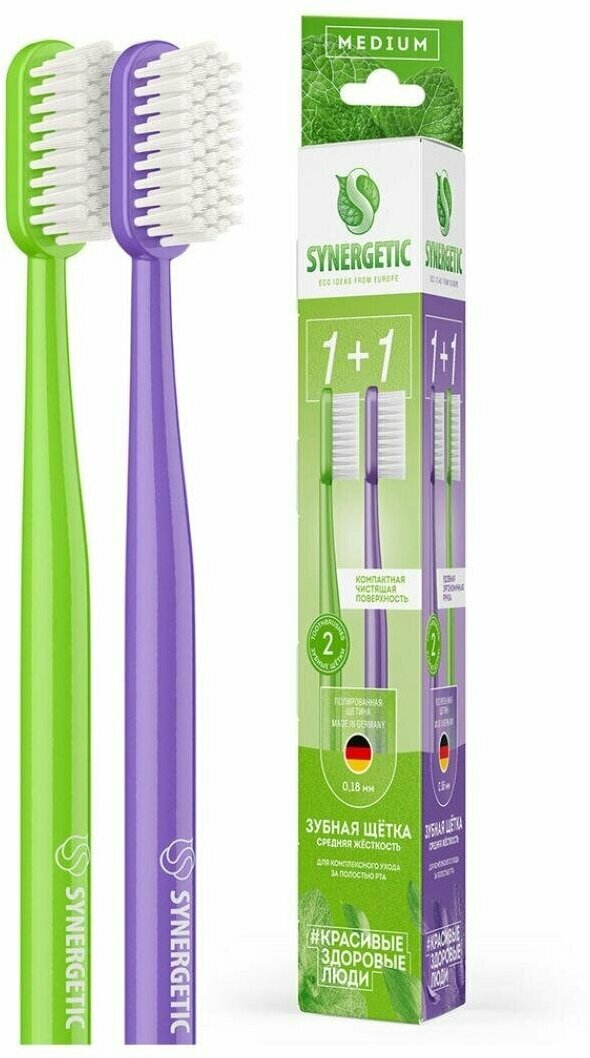 Набор состоит из двух зубных щеток средней жесткости для взрослых SYNERGETIC Eco dental care, разработанных с учетом рекомендаций ведущих стоматологов для ежедневного комплексного ухода за полостью рта. Щетки с эргономичной ручкой обеспечивают максимально комфортное очищение зубов и десен. Компактная чистящая поверхность с отполированной нейлоновой щетиной толщиной 0,18 мм Dentex® S, которую производит компания Pedex GmbH Perlon® The Filament Company (Германия), позволяет эффективно удалять налет, не повреж