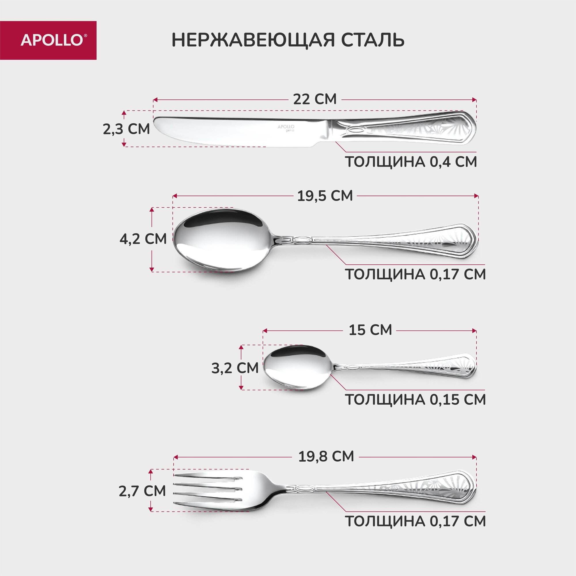 В наборе: 6 столовых вилок, 6 столовых ложек, 6 чайных ложек, 6 столовых ножей.