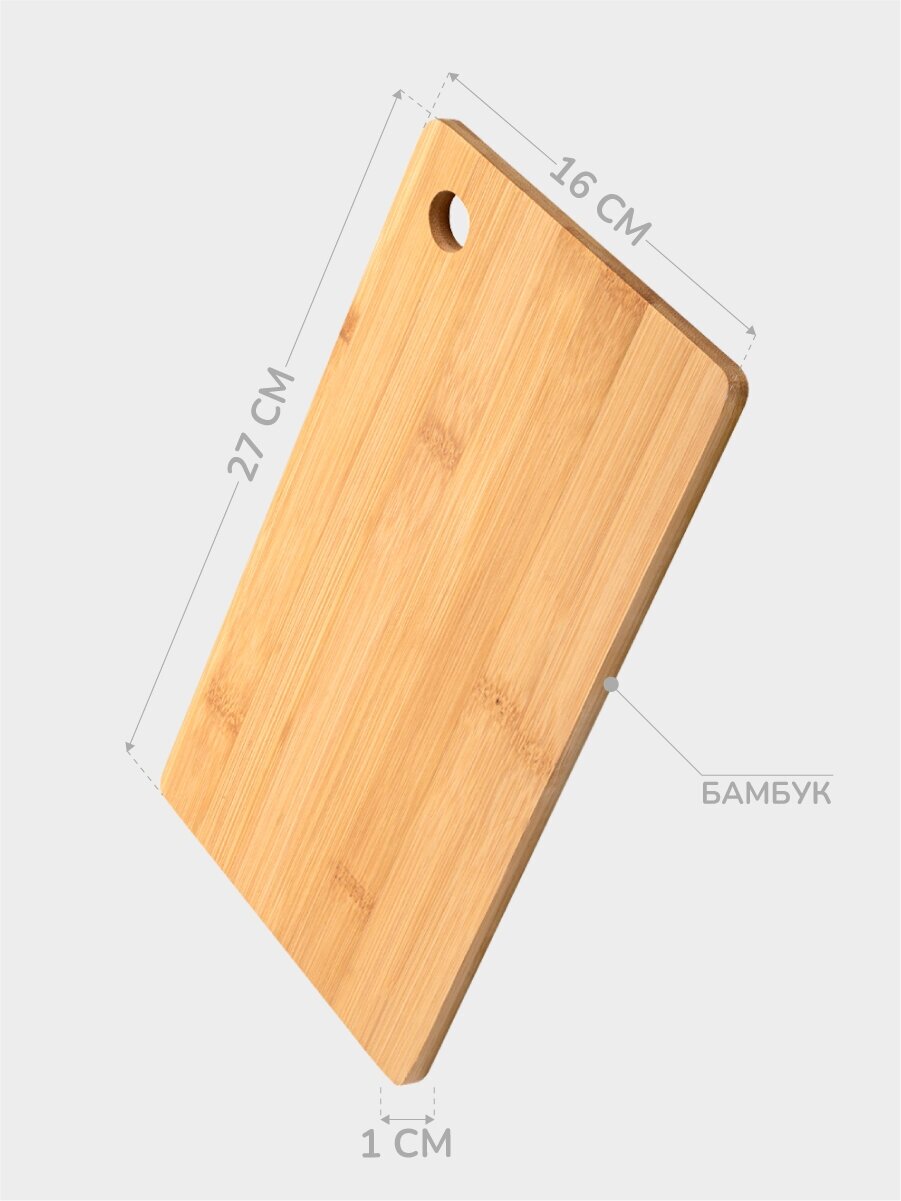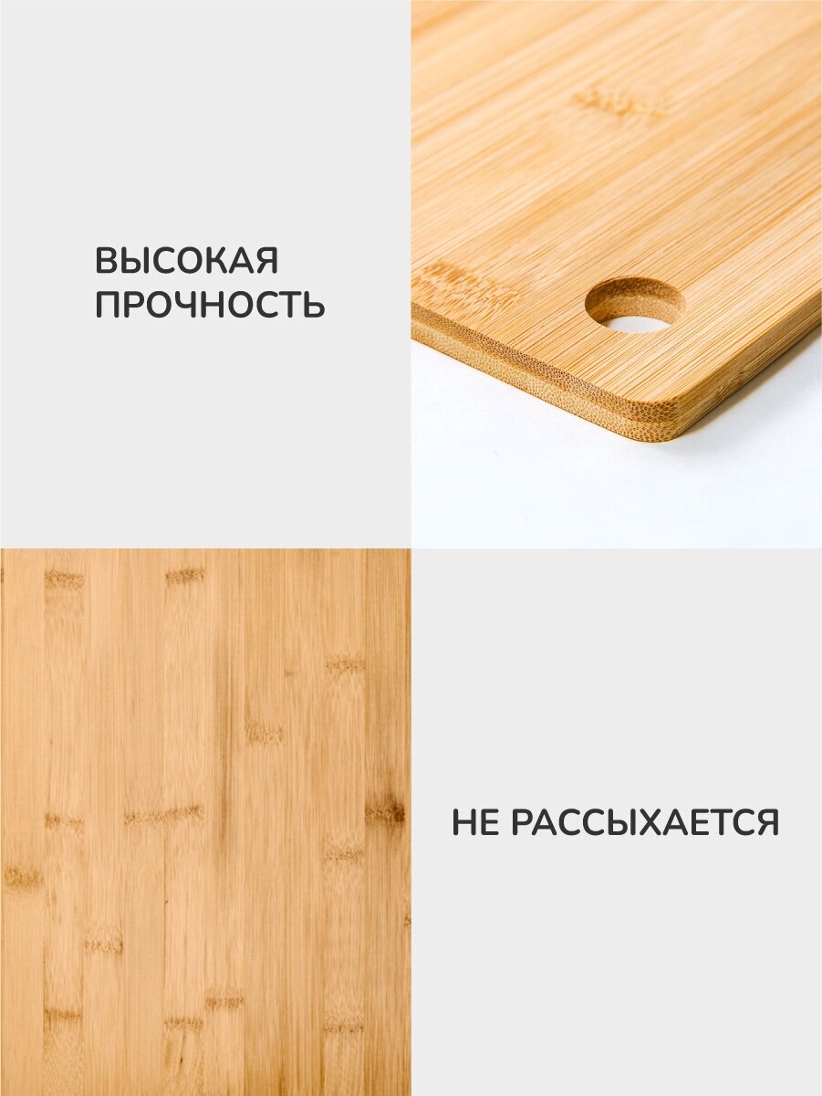 Доска предназначена для разделывания рыбы, мяса, нарезки овощей, фруктов, колбас, сыра и хлеба. Доску можно использовать для сервировки различных продуктов и блюд, а также в качестве подставки для защиты кухонных поверхностей от горячей посуды (кастрюль, тарелок, сковородок и форм для выпечки). Бамбуковая доска прочна, долговечна, износостойка, и прекрасно подходит для ежедневного использования. Бамбук стоек к механическим повреждениям, но при этом не тупит лезвия ножей при использовании.