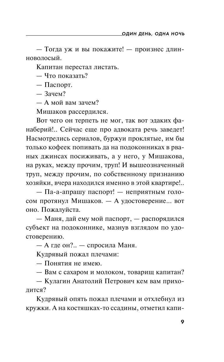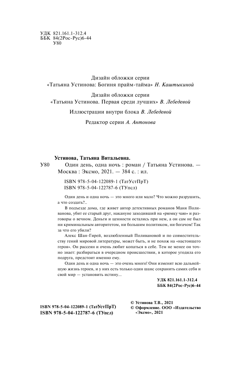 Еще одна книга о Мане Поливановой и ее друге. Переиздание. Впервые вышла в свет в 2013 году. Книга входит в два цикла - "Алекс Шан-Гирей" и "Писательница Маня Поливанова". Первая книга цикла о Мане - "С небес на землю". Далее - "Неразрезанные страницы", "Один день, одна ночь", "Судьба по книге перемен". ГГ-ня книги "Один день, одна ночь" Маня Поливанова, писательница детективных романов, и ее любимый человек Алекс Шан-Гирей, талантливый и известный писатель, оказались в центре расследования убийства Анатоля, который накануне был у них в гостях. Сюжет динамичный (детектив+мелодрама), неплохие флэшбэки и мягкий устиновский юмор... Событий много, поскольку с Маней все время что-то случается. Тронуло до глубины души спасение собаки, которую обнаружили во дворе издательства и чуть не убили жестокие люди... Также мы встречаемся и другими героями, знакомыми нам по другим произведениям цикла. Получит продолжение линия "Катя Митрофанова - Владимир Береговой", чьи отношения наконец-то сдвинутся с мертвой точки. Персонажи живые - как положительные, так и отрицательные (Анатоль, сестра Таис) или относительно нейтральные (глупенькая балерина, чей образ очень уж узнаваем).