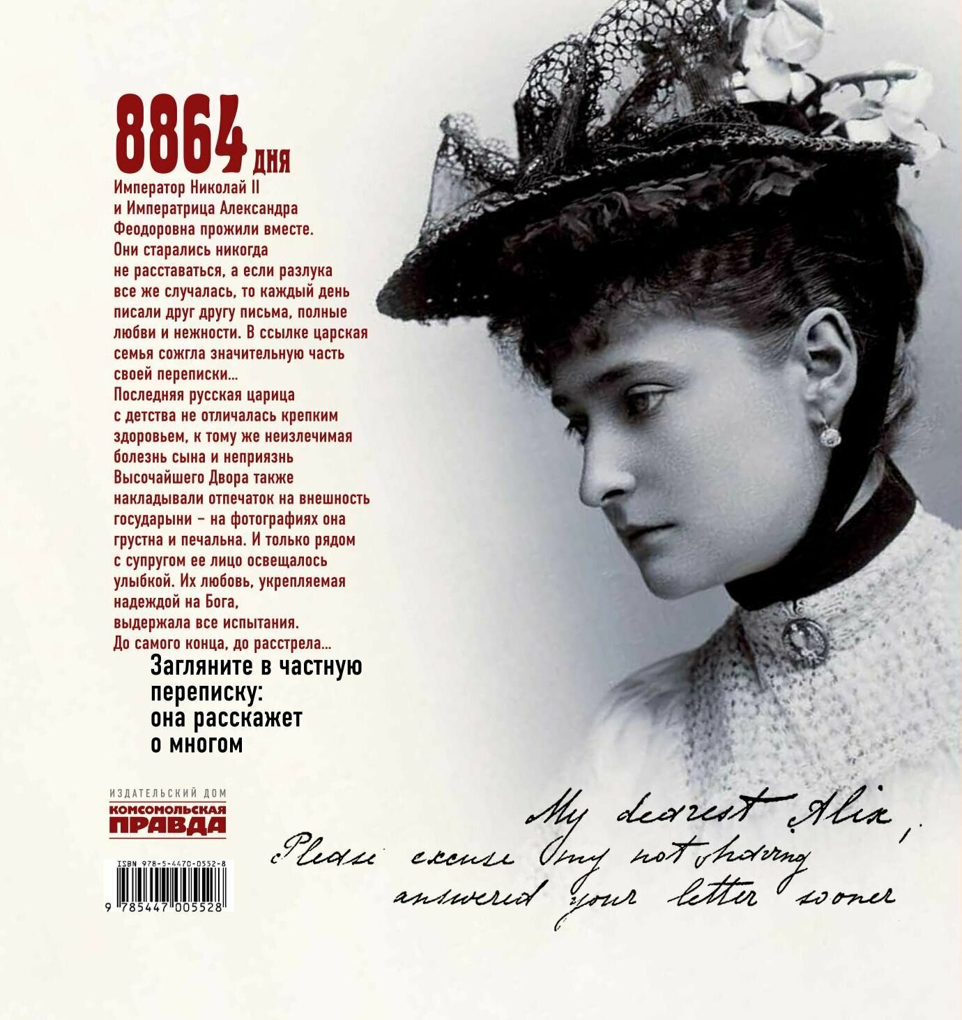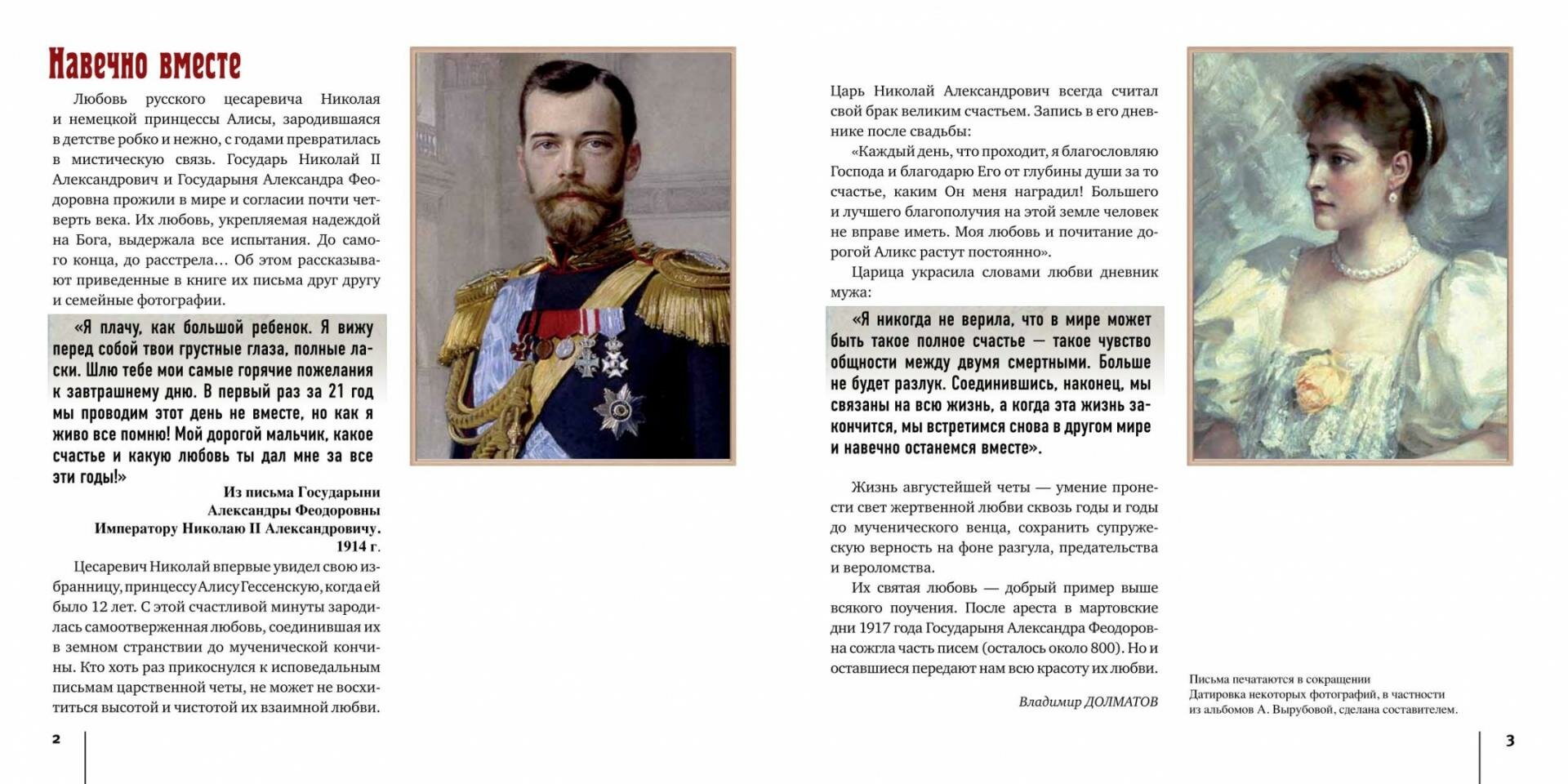 История любви Императора Николая II и Императрицы Александры Федоровны стала легендой. Они старались никогда не расставаться, а если разлука все же случалась, каждый день писали друг другу письма полные любви и нежности. После революции переписка венценосных супругов на многие десятилетия оказалась упрятанной в архивах. Публикуя сегодня эти редкие письма мы дополнили их малоизвестными семейными фотографиями того же времени. Невероятная любовь и супружеская верность государя и государыни, пронесенные до мученического венца, на фоне тяжких испытаний, предательства и вероломства, поражают всякого, прикоснувшегося к их личной тайне. Личная переписка, которая расскажет о героях больше, чем учебники по истории.