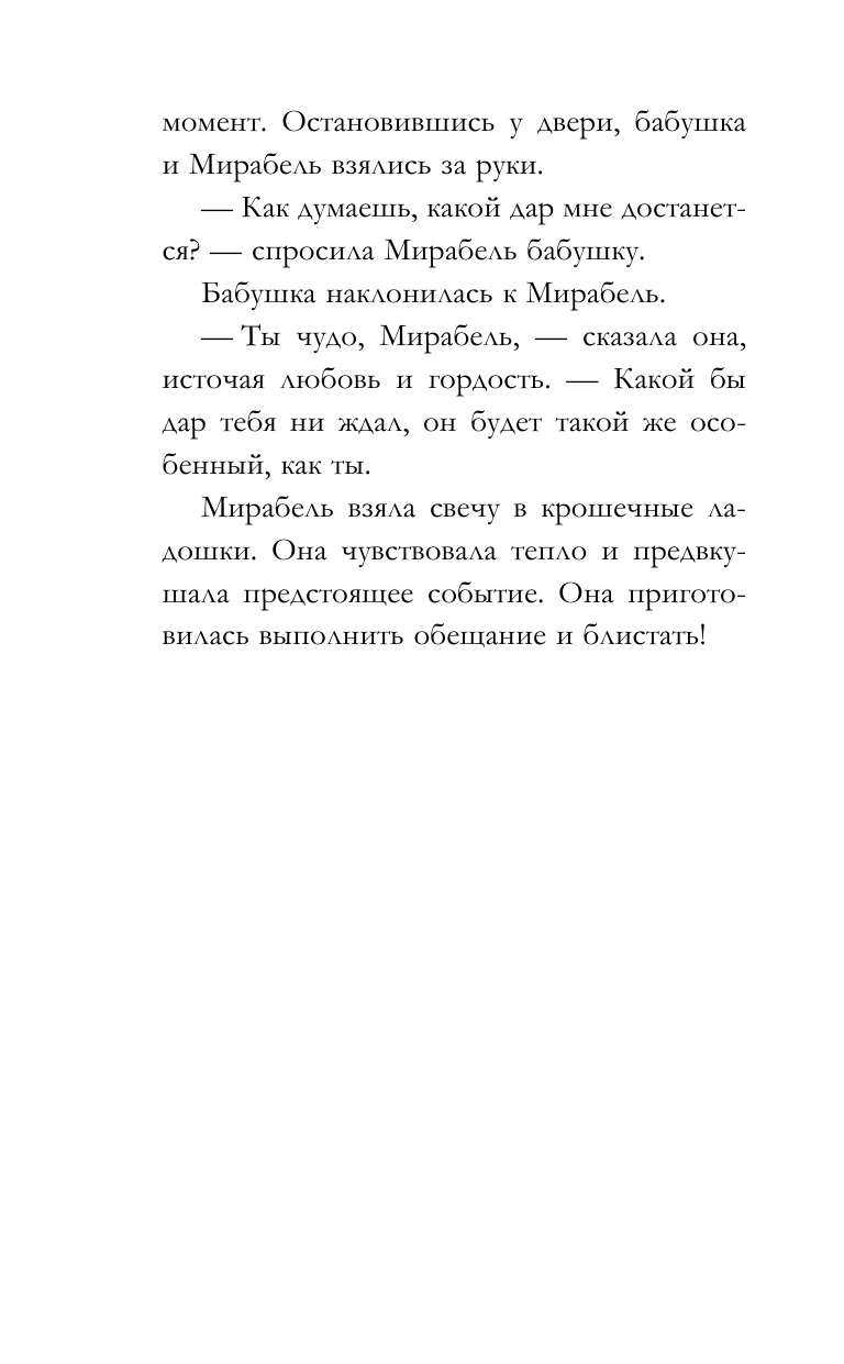 Мои дети обожают диснеевские мультики, купила книгу, чтобы порадовать их. По правде говоря, приключения Мирабель увлекли не только их, но и меня, не терпится посмотреть мультфильм, книга только подогрела интерес, так что смотреть будет еще интереснее:-) Кстати, в книге есть специальная вклейка с кадрами будущего мультика, отличный бонус, на мой взгляд.