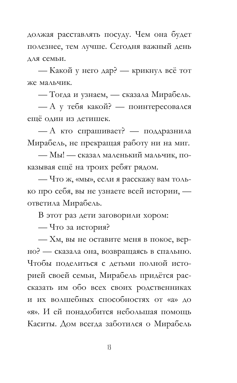 Из неё вы узнаете историю Мирабель и её семьи, в которой каждый (кроме самой Мирабель) обладает каким-то волшебным даром. И когда над магией семьи и чудесного края, в котором они живут - Энканто - нависает страшная угроза, Мирабель оказывается единственной, кто в силах спасти свой дом и родных.
