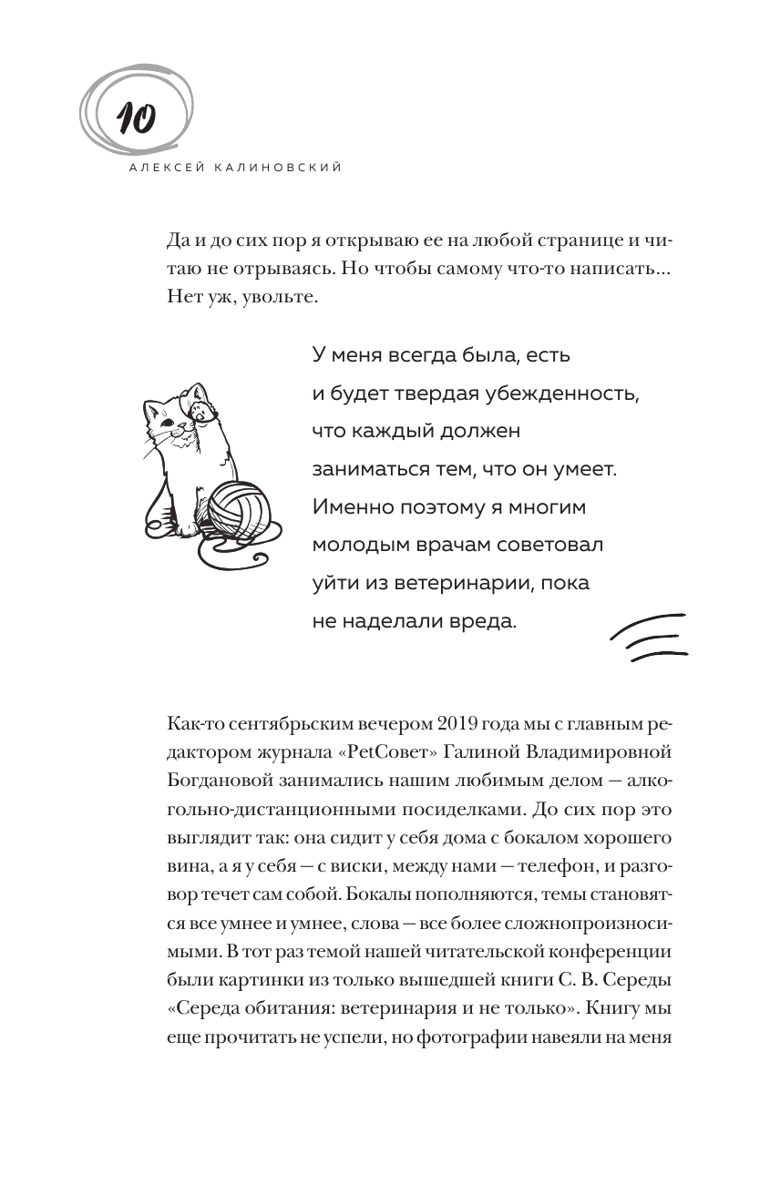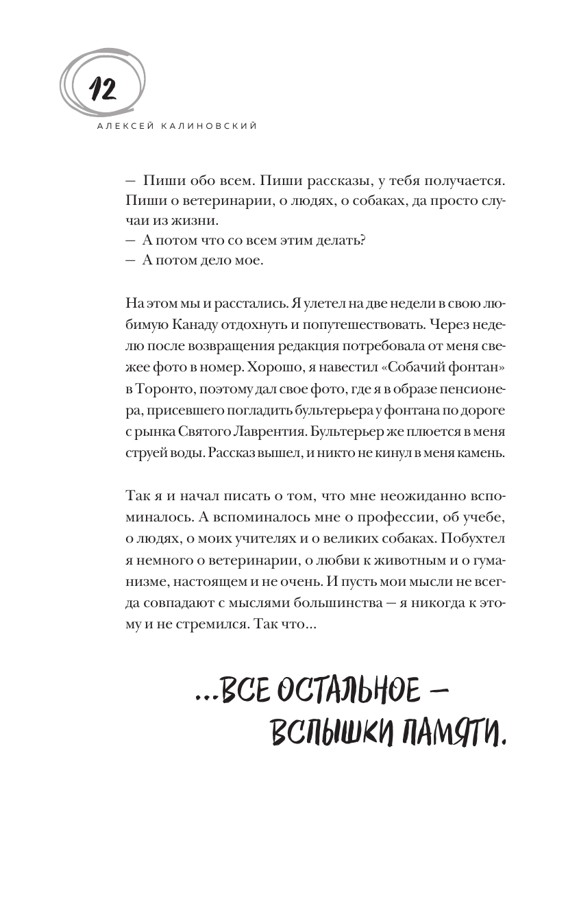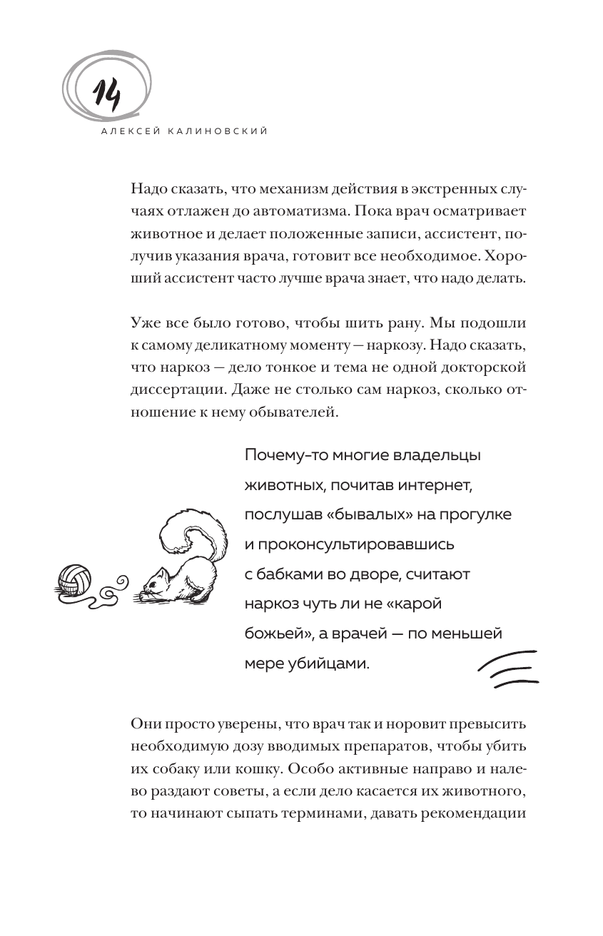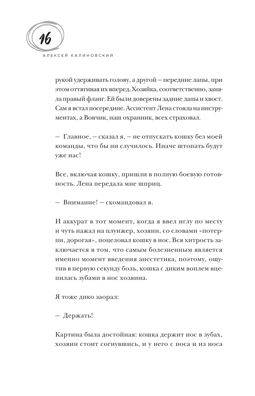 В каждой профессии - свои тараканы. А в профессии ветеринарного врача кроме тараканов есть еще собаки, кошки, козы, куры, хомяки и, конечно, их владельцы. Нескучные истории от самого веселого в России ветеринарного врача, открывшего первую частную ветклинику в Москве еще в девяностых, приоткроют завесу в закулисье непростой профессии. Если вы восхищаетесь необыкновенными рассказами и вкусным ироничным слогом Джеральда Дарелла, обожаете невыдуманные истории из жизни людей и животных, то эта книга точно для вас! Веселые и грустные рассказы Алексея Анатольевича Калиновского о людях, с которыми ему довелось встречаться в жизни, о животных, которых ему посчастливилось лечить и о невероятных ситуациях, которые случались в его ветеринарной практике, захватывают с первых строк и погружают в атмосферу доверительной беседы со старым другом!